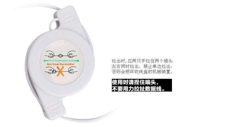 备注:同款还有苹果IPHONE5&6接口,单价贵1元。双拉产品使用时需要两端一起拉,只拉一端会损坏产品结构,因此而造成的损失本店概不负责。产品特点轻便的伸缩线,小巧精美,可轻易的调到您喜欢的长度,使线与机身形成一个的搭配,不易弄坏,为您的爱机带来的数据充电需求。数据充电完成后,收线更便捷,双手向两端拉到底然后松手自动收回。