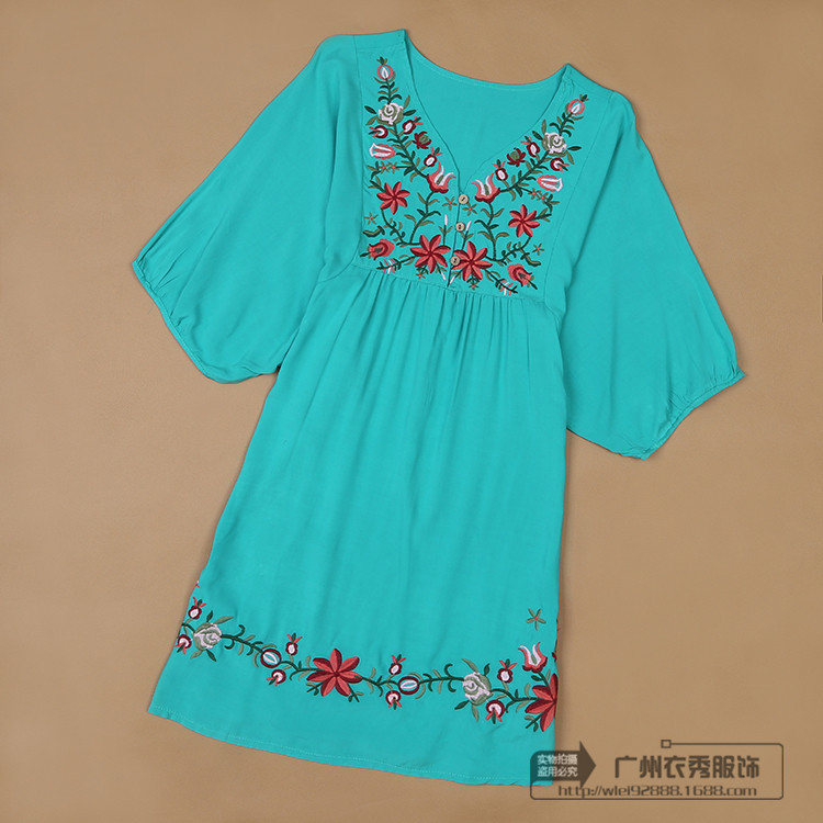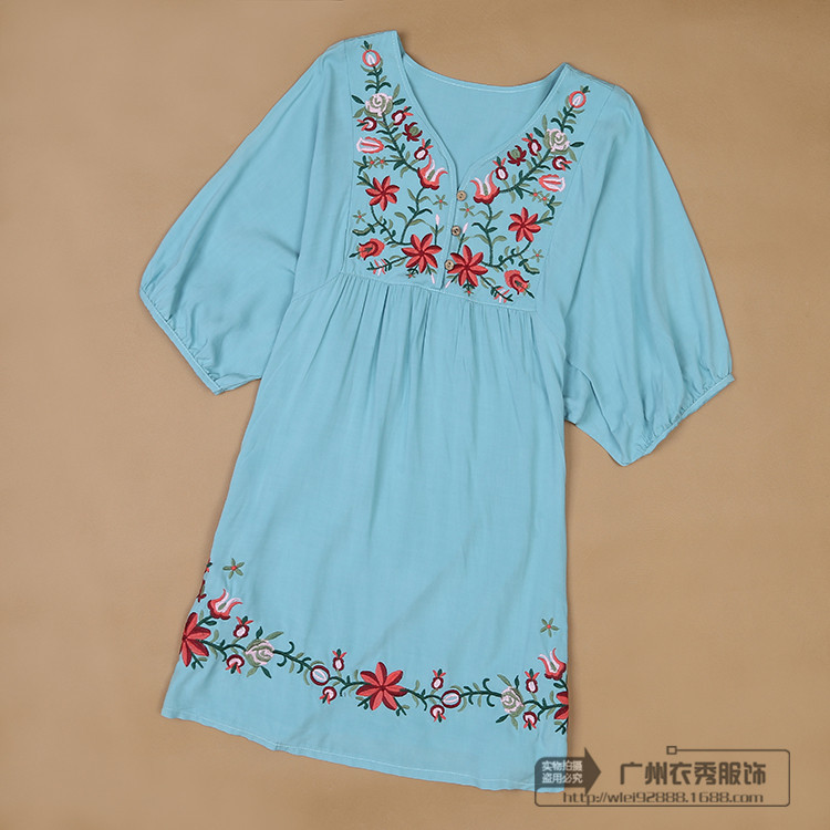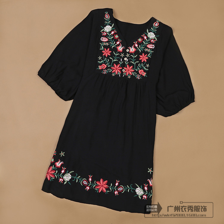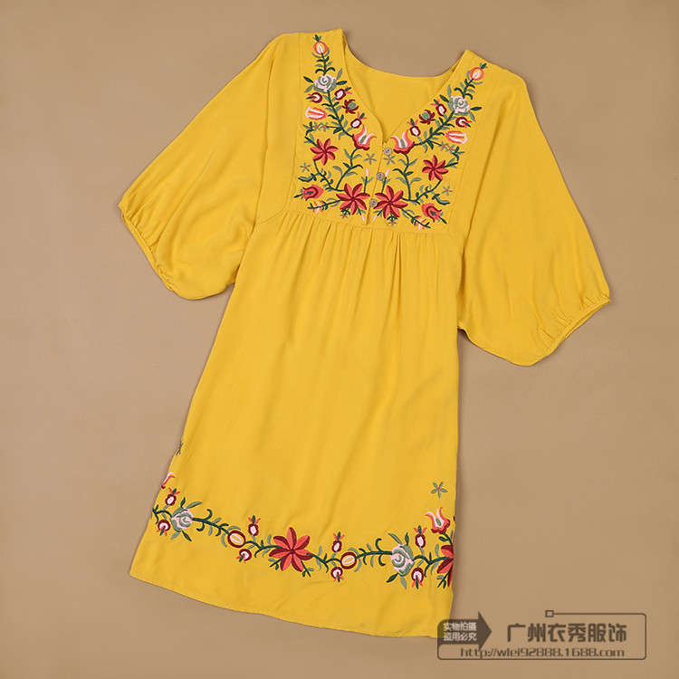 공장 직접 판매 유럽과 미국의 새로운 여성 의류 도매 민족 스타일 V 넥 7부 소매 위치 자수 느슨한 드레스스토어 가기
