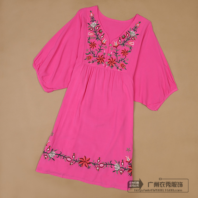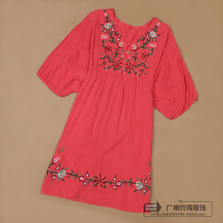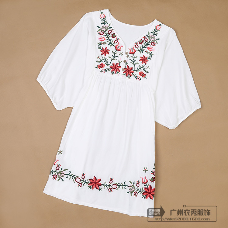 공장 직접 판매 유럽과 미국의 새로운 여성 의류 도매 민족 스타일 V 넥 7부 소매 위치 자수 느슨한 드레스