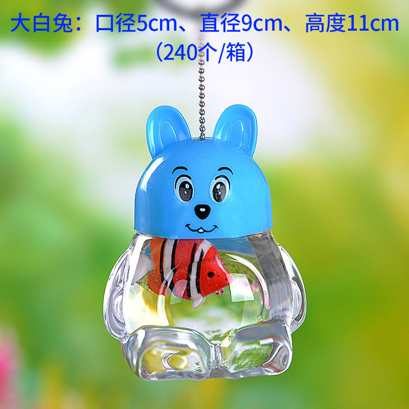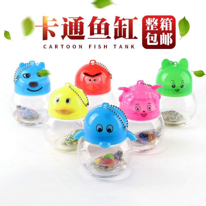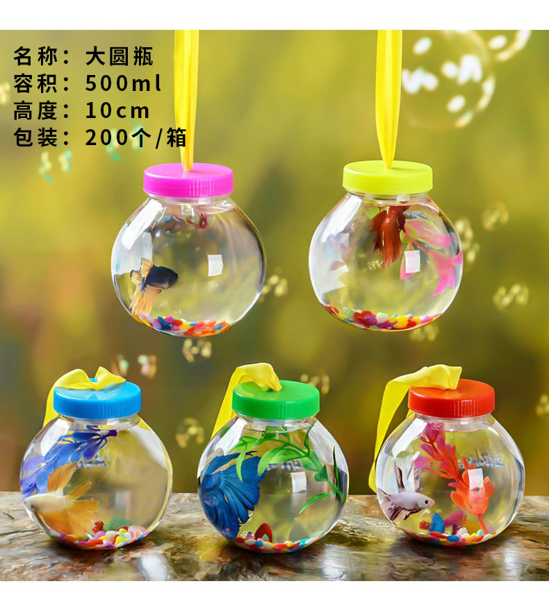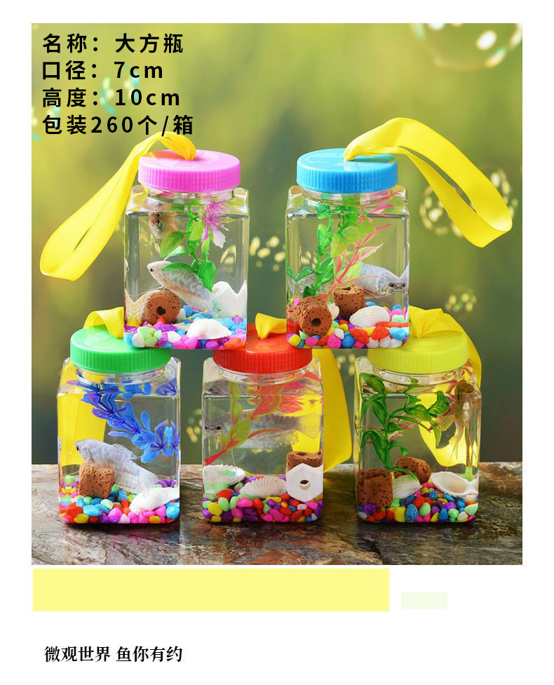 本产品小巧时尚、独特卡通造型,自上市以来得到了众多小朋友和时尚男女的青睐。可以方便随意的手提、悬挂在包上、放置于书桌、装饰柜、床头、办公桌等任何地方,对于调节情绪、缓解压力和因长时间看书而引起的眼部疲劳有明显的缓和作用。是馈赠亲友的一种极富高雅情趣的礼品。上面的盖子可以随意打开,方便换水投食,盖子上有供空气流入的小口,水不会从口中大量涌出。这种迷你小鱼缸适合养殖各种色彩斑斓的小鱼,从外面往里面看就可以看到一只超大漂亮的鱼,正常喂养(三天放一粒鱼食与换一次水)一尽量放在有阳光的地方,让鱼有充足的氧气呼吸。可养活很哟!