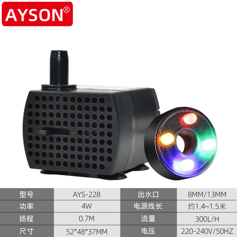 | 4W (AYS-228) | 220V-240V/50HZ | 4W | 0.7M | 300L/H | 52*48*37MM |