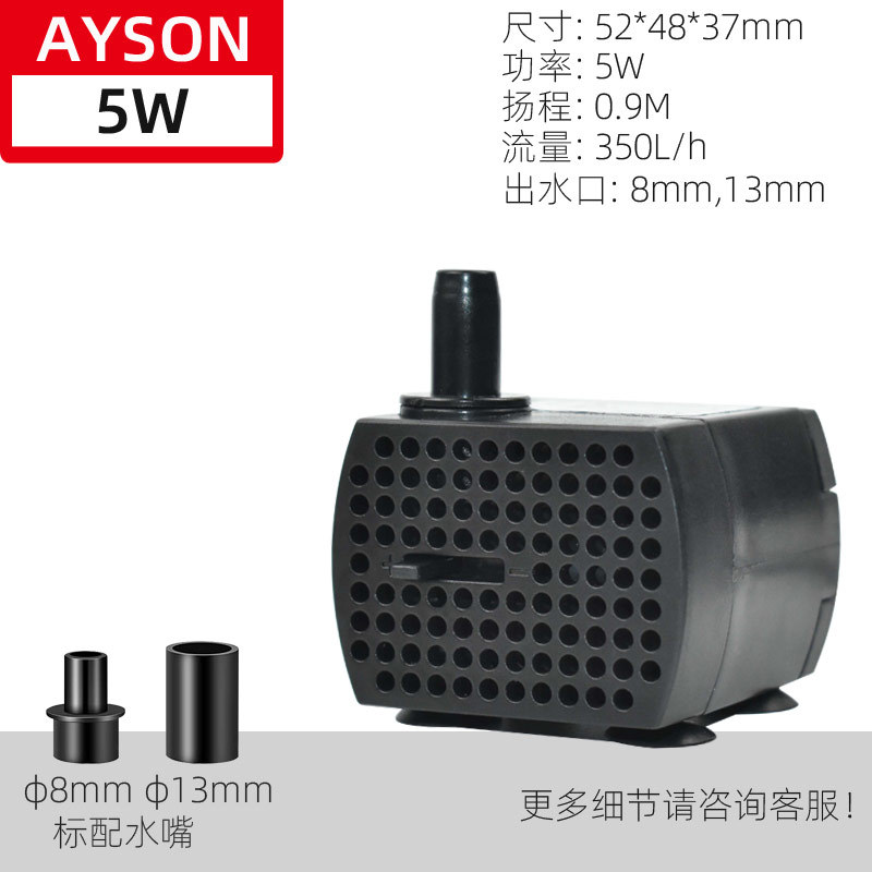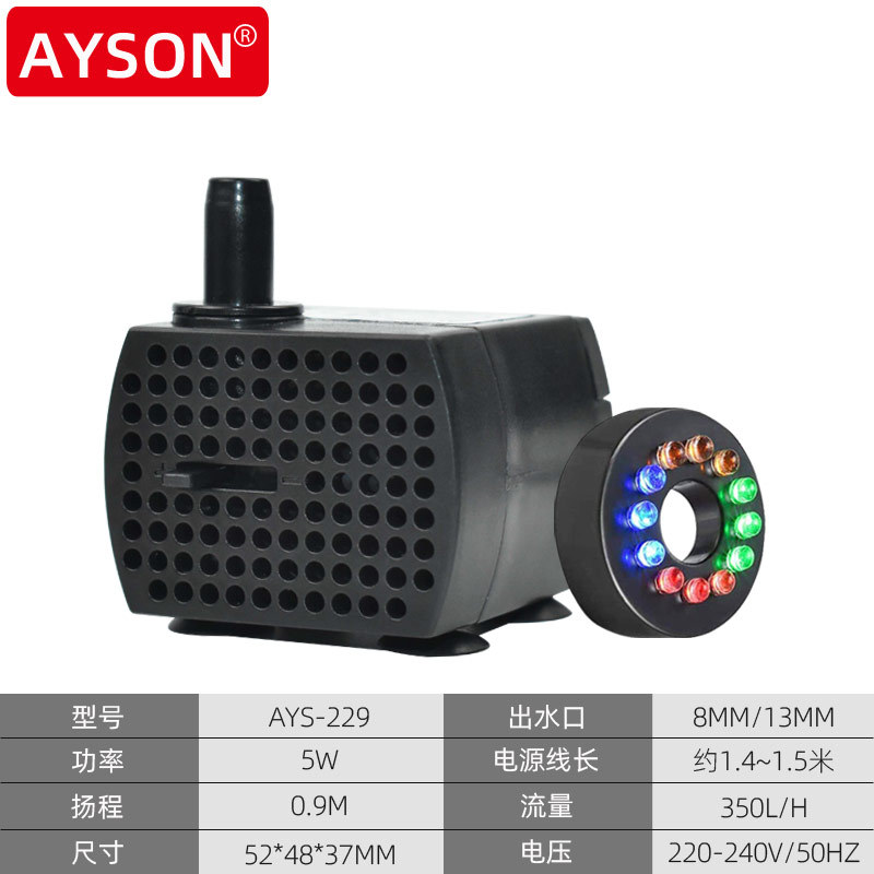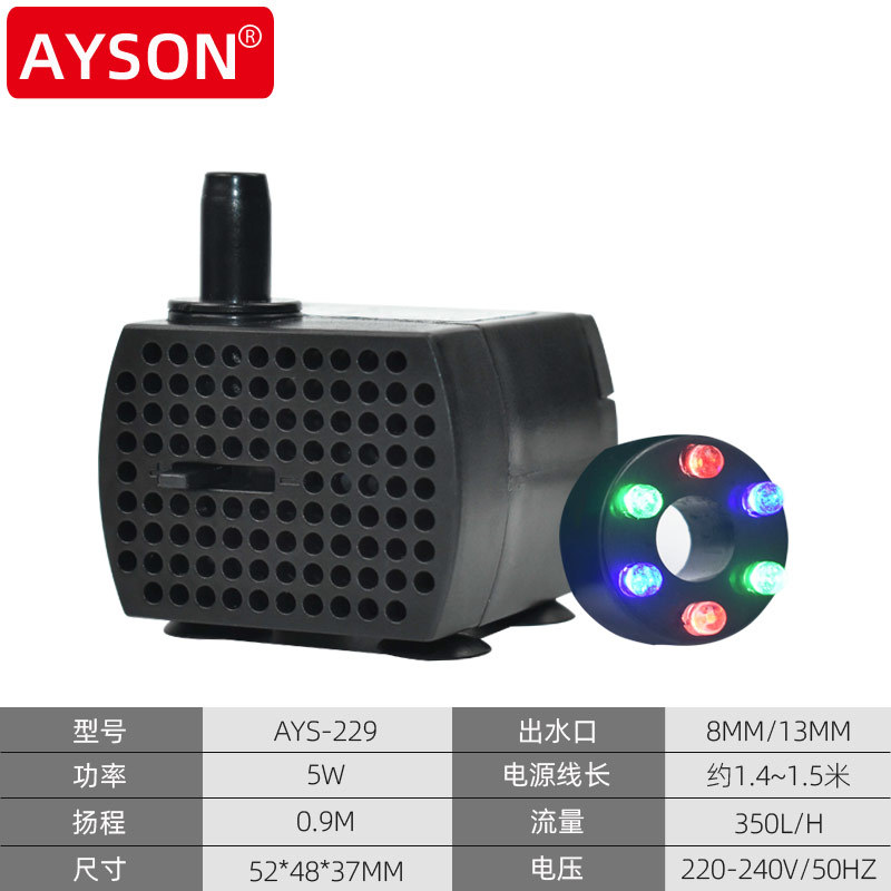 | 5W (AYS-229) | 220V-240V/50HZ | 5W | 0.9M | 350L/H | 52*48*37MM |