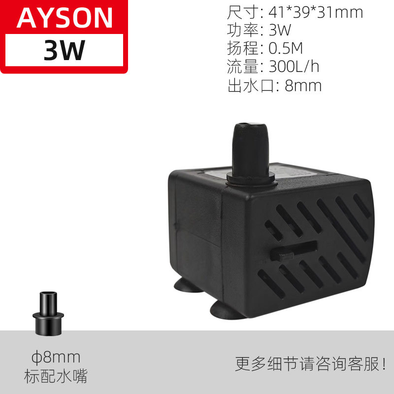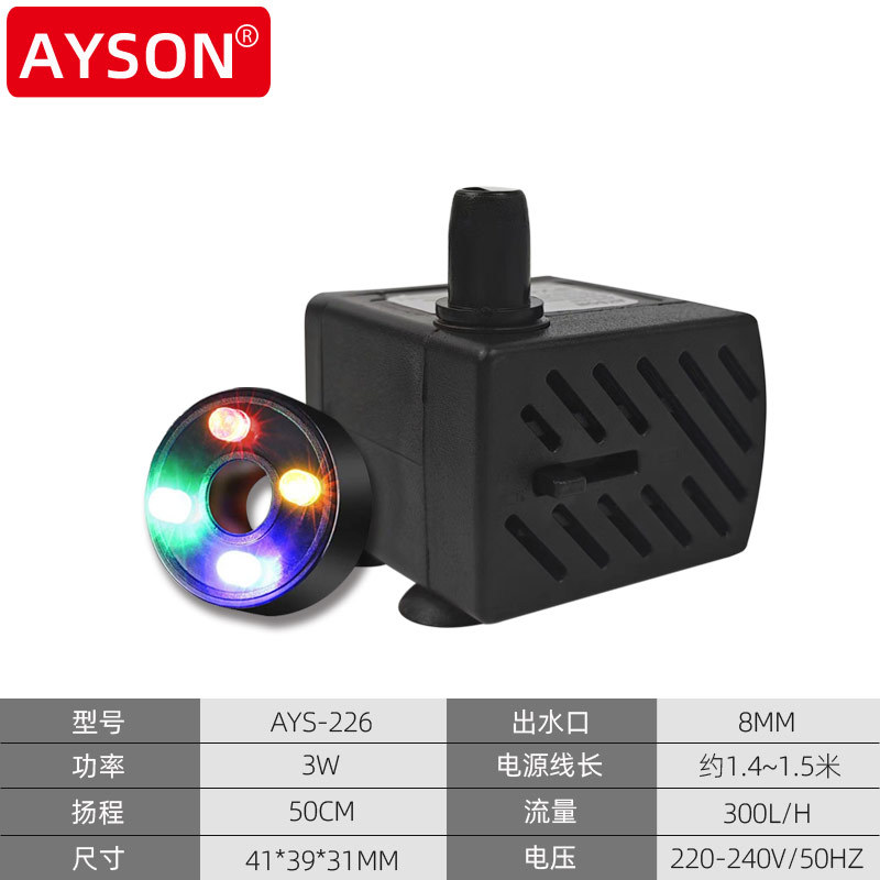 | 3W (AYS-226) | 220V-240V/50HZ | 3W | 0.5M | 300L/H | 41*39*31MM |
