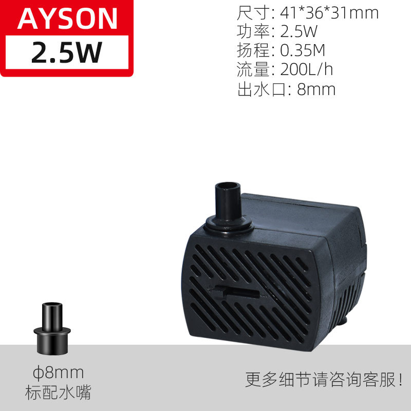 | 2.5W (AYS-200) | 220V-240V/50HZ | 2.5W | 0.35M | 200L/H | 41*36*31MM |