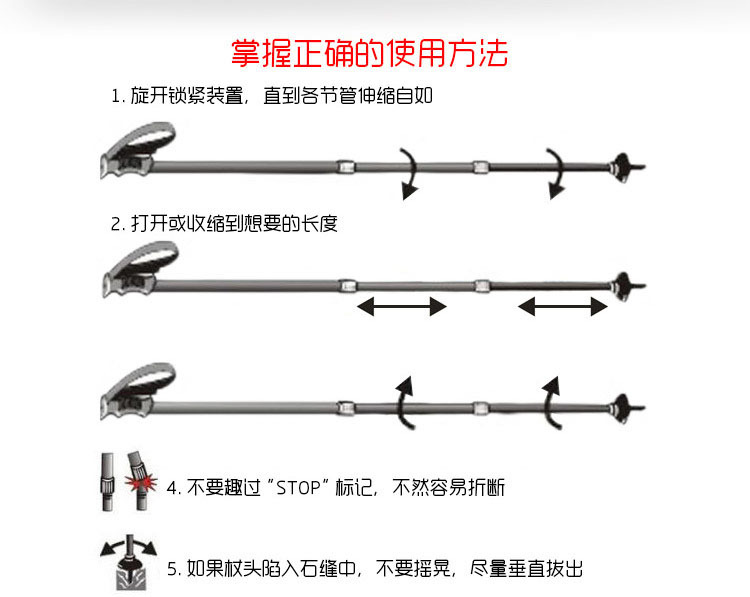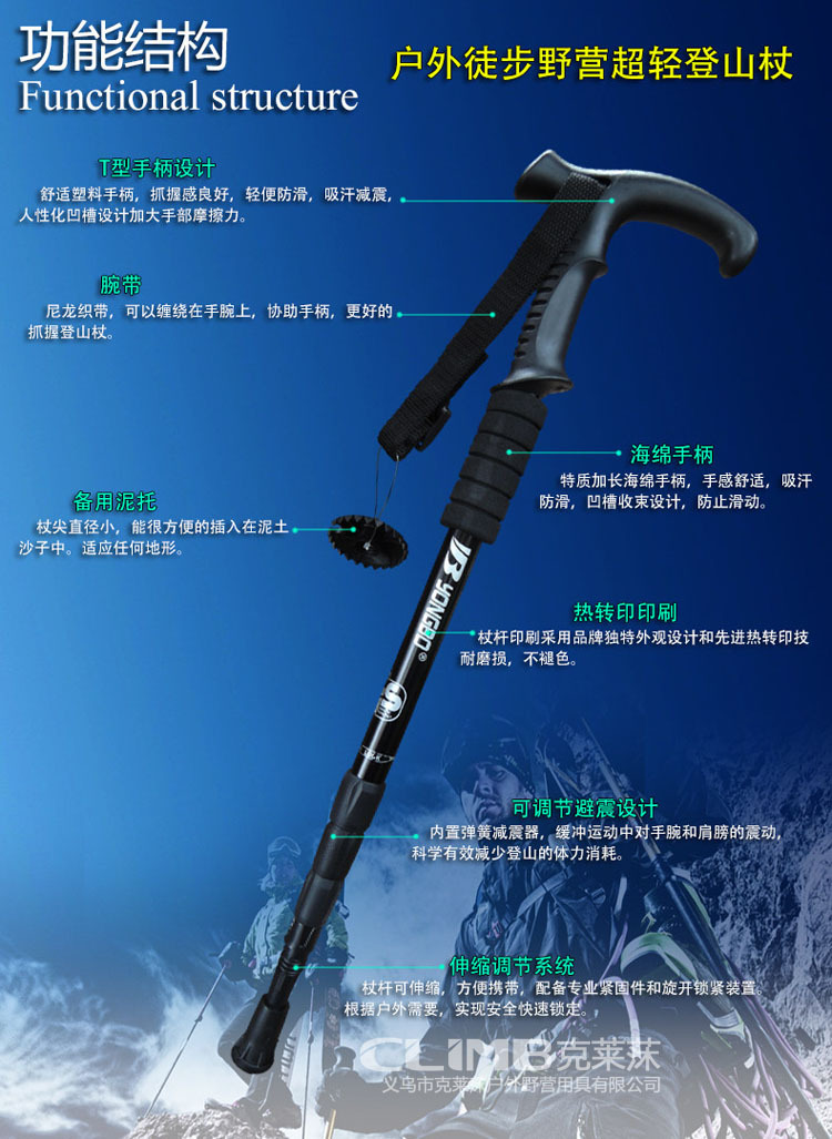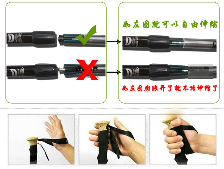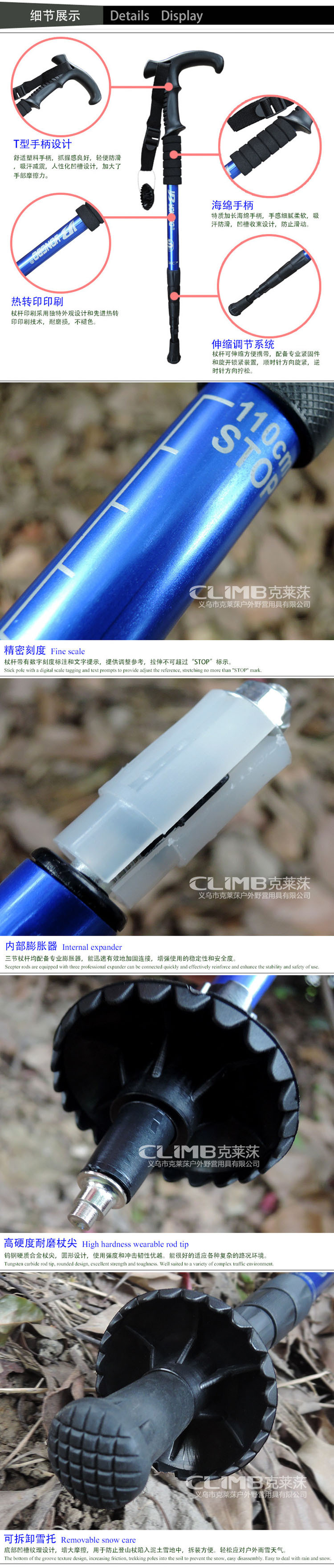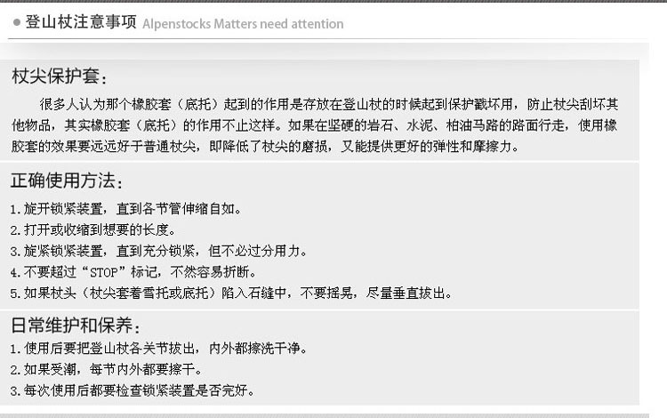 3.防滑手柄的手感舒适,配有防雪盖。杖尖直径小,能很方便的插入在泥土沙子中,适应任何地形。