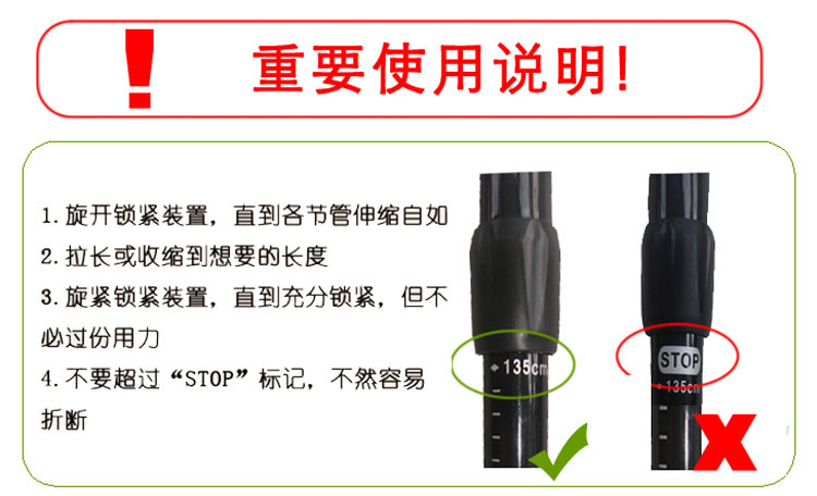 1.弹簧避震,螺旋三重锁定。重量轻,便于携带。