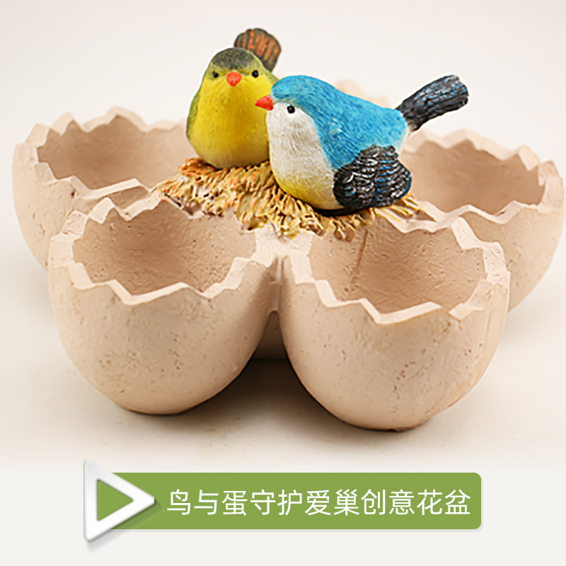 鸡与蛋守护爱家创意花盆和鸟与蛋守护爱巢创意花盆,独特的外观设计,手工制作,采用合成树脂,手工彩绘上色,质感舒服。呆萌活泼,萌萌新宠,DIY微景观必不可少的的花盆,更是多肉粉的爱。生活的艺术在缸的别样设计,动物与植物的结合。蛋花盆小巧,比较适合种植单株多肉等植物,蛋的种植空间:5cm*5cm*4cm。花盆是用树脂材质的,具有牢固耐用、节水抗旱、不易变形、耐腐蚀、可降解、透气、质感舒服等特性。