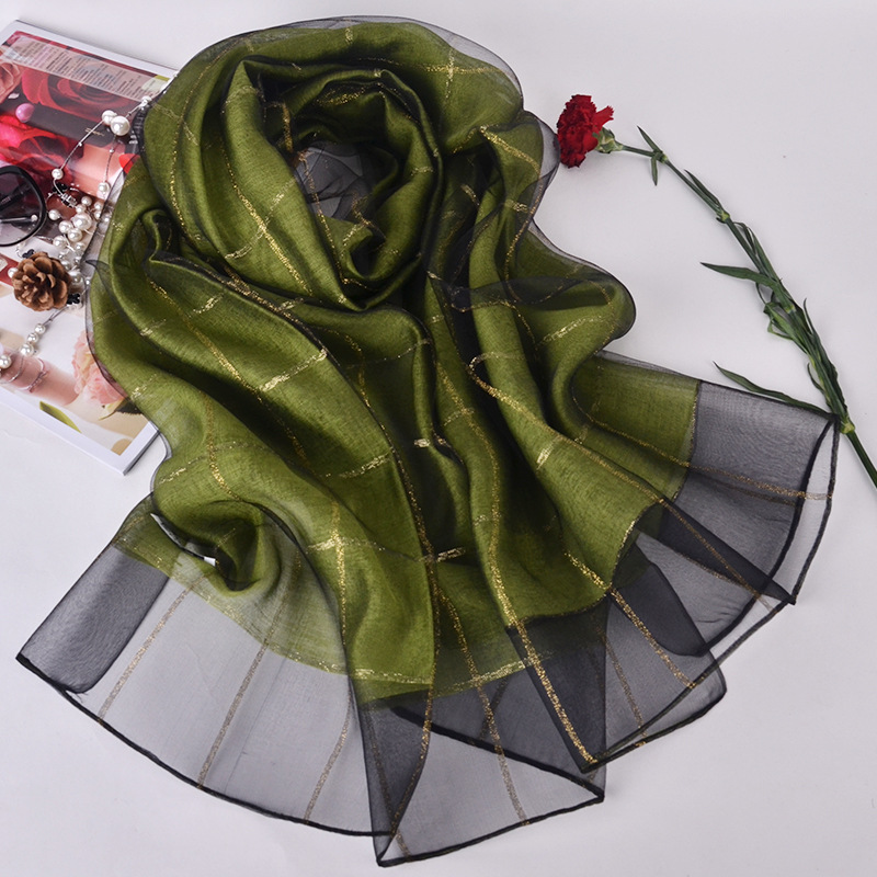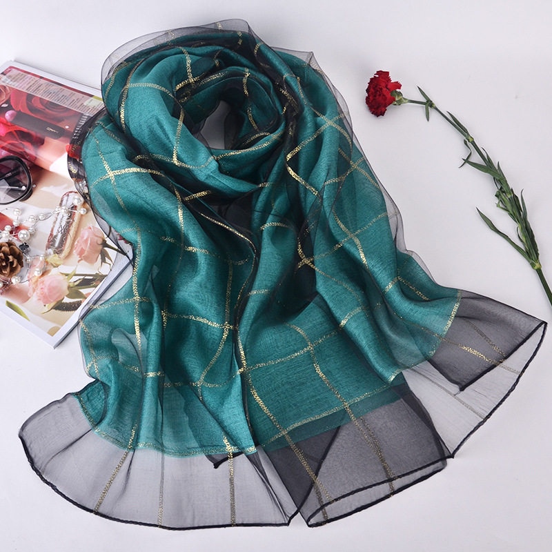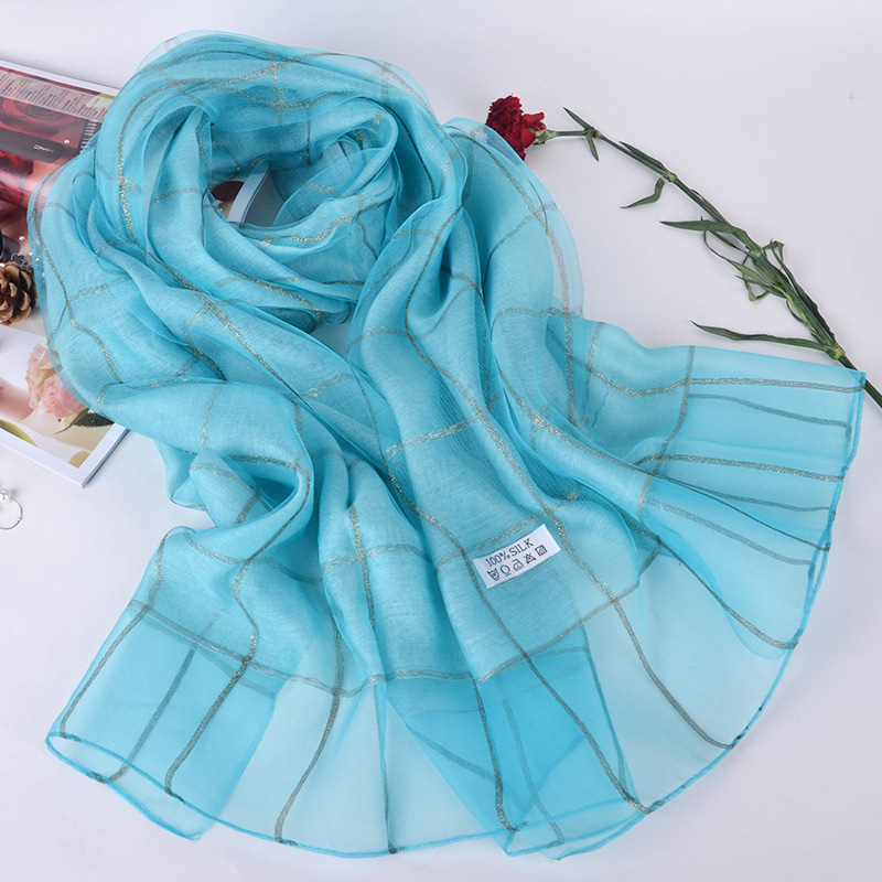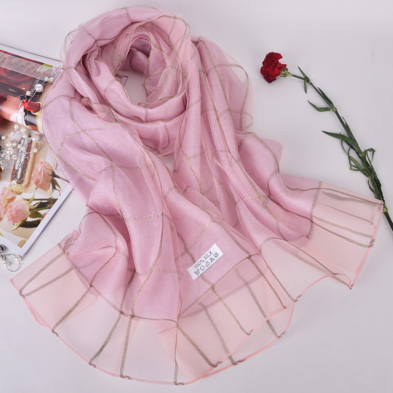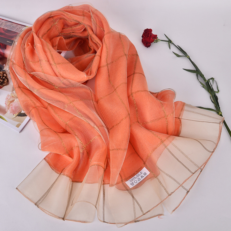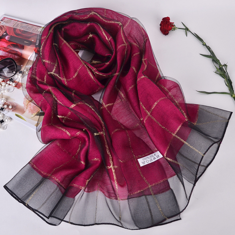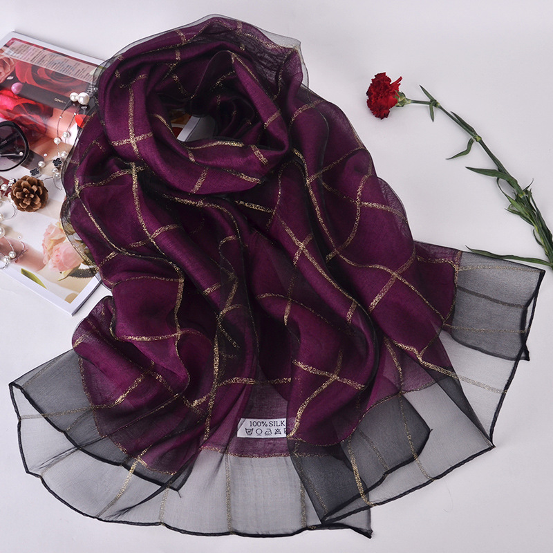 2017年 新款!送礼丝巾!双层真丝围巾披肩女长款格子金线蚕丝丝巾,