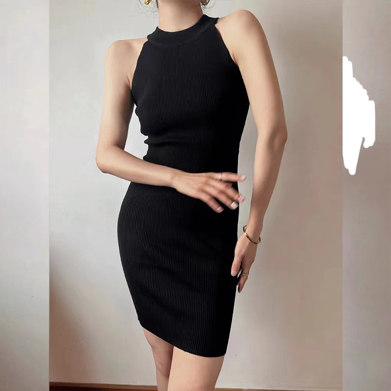 여름 여성용 레트로 홀터넥 오프 숄더 니트 드레스, 슬림하고 다재다능한 퓨어 디자이어 힙 스커트, 민소매 조끼 스커트