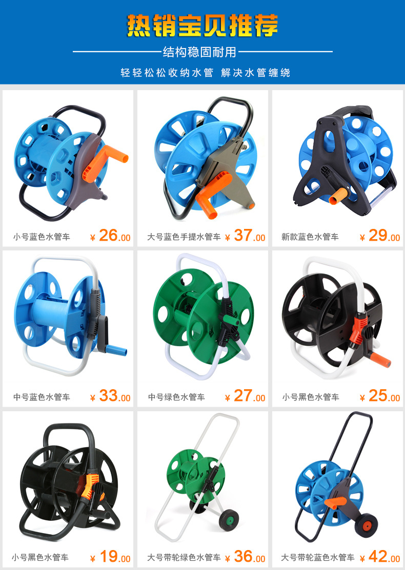 • 德国新款水管架,德国设计,由进口聚丙烯和镀锌钢管组成,可绕25-30米水管,可承受6-8公斤的压力,结构合理,携带方便,配合各型号喷枪接头使用,可用于洗车、浇花等,质量可靠!