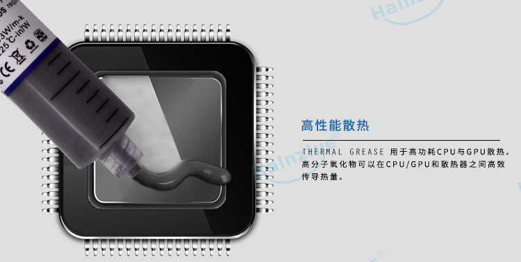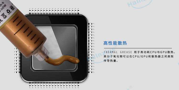 CPU、显卡等设备散热,发热元件(如功放、IC、发热管)与散热器之间传递热量的媒介,导热系数:大于0.85W/mK。