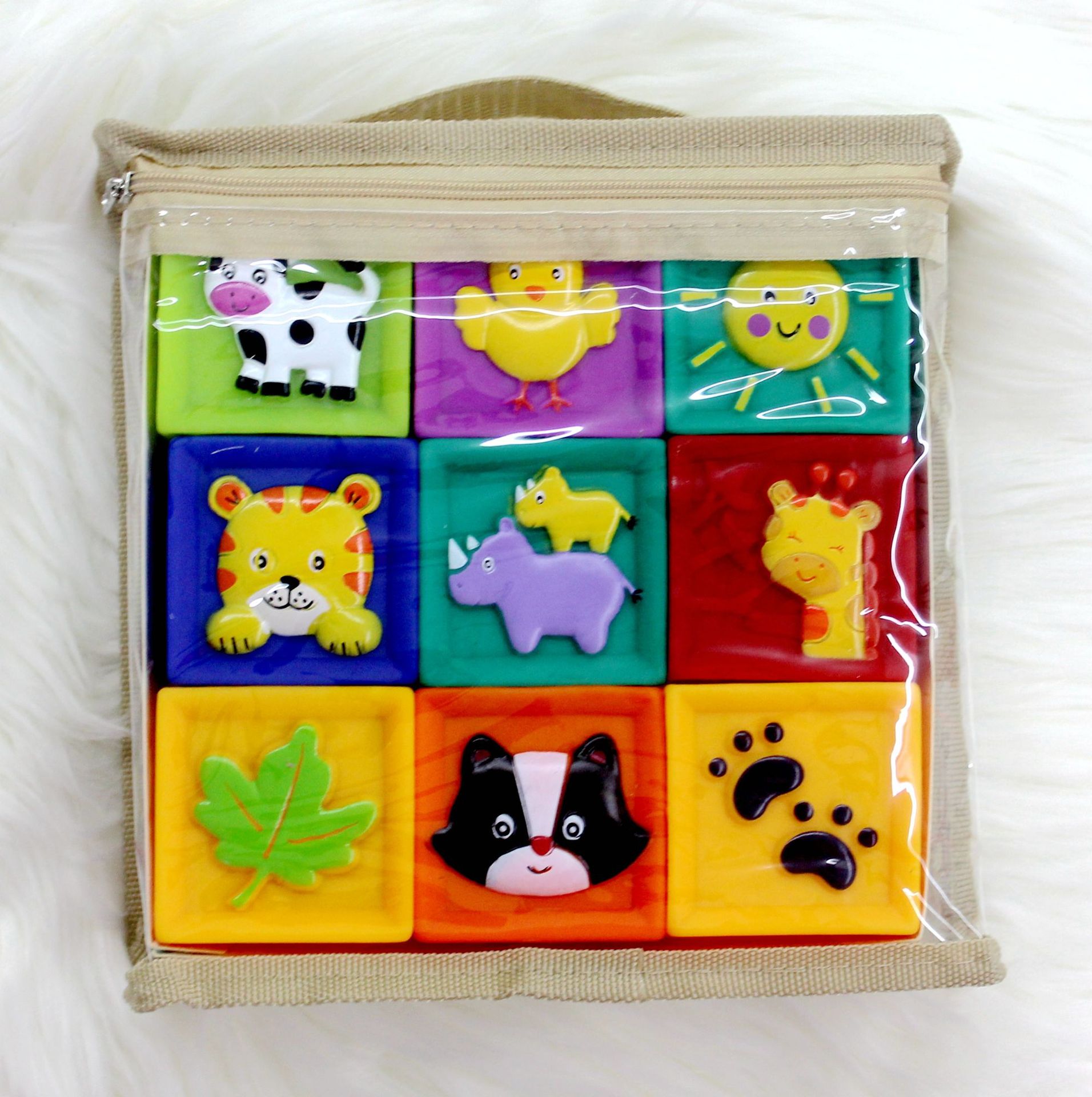 一套积木有九个,有多种配色,每个面都是立体浮雕,有数字动物植物颜色等,让宝宝在玩乐中学习.