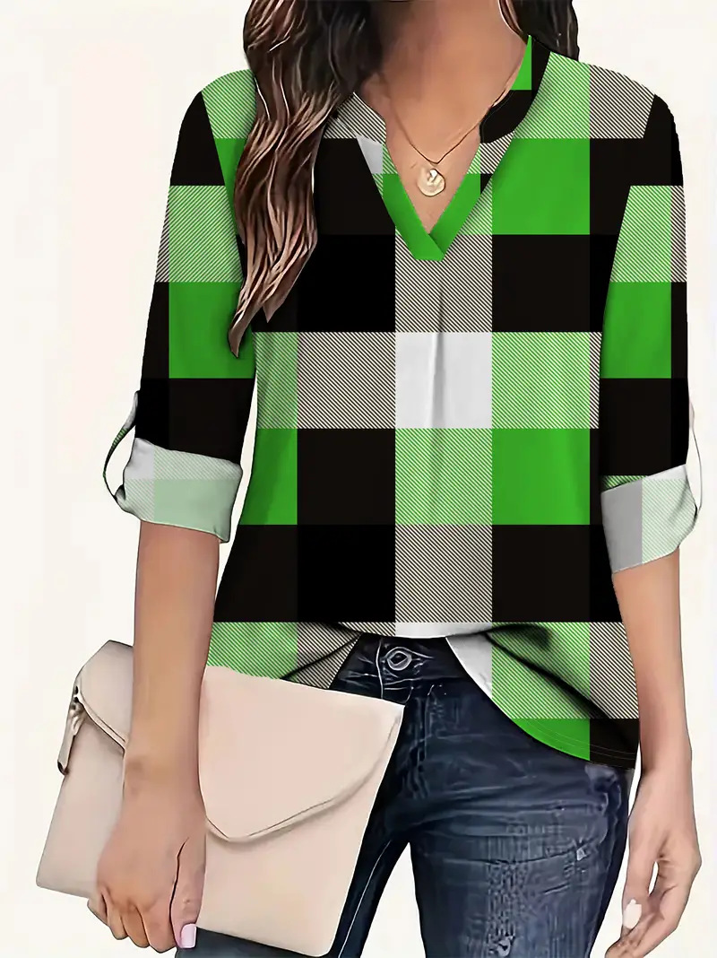 아마존 AliExpress 폭발 여성 격자 무늬 인쇄 봄과 가을 우아한 V-목 긴 소매 느슨한 셔츠 티셔츠 여성