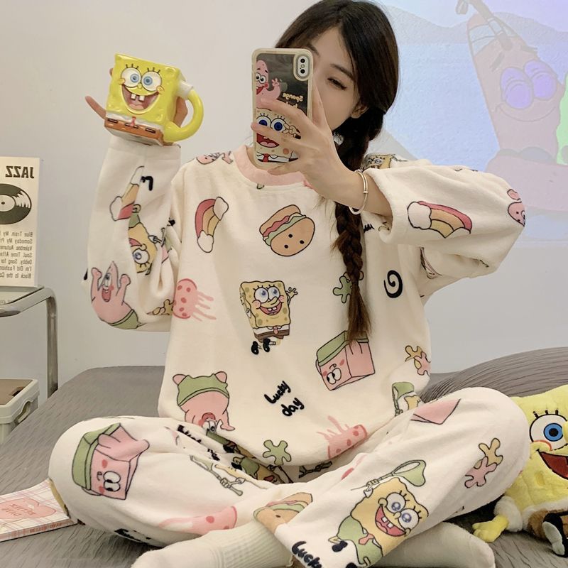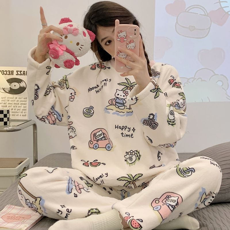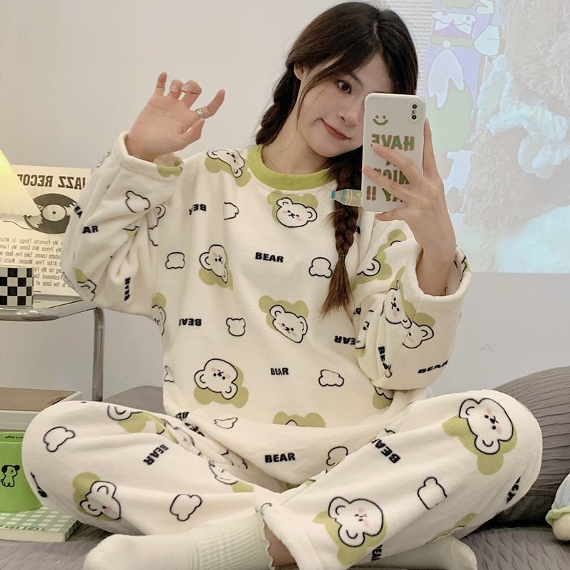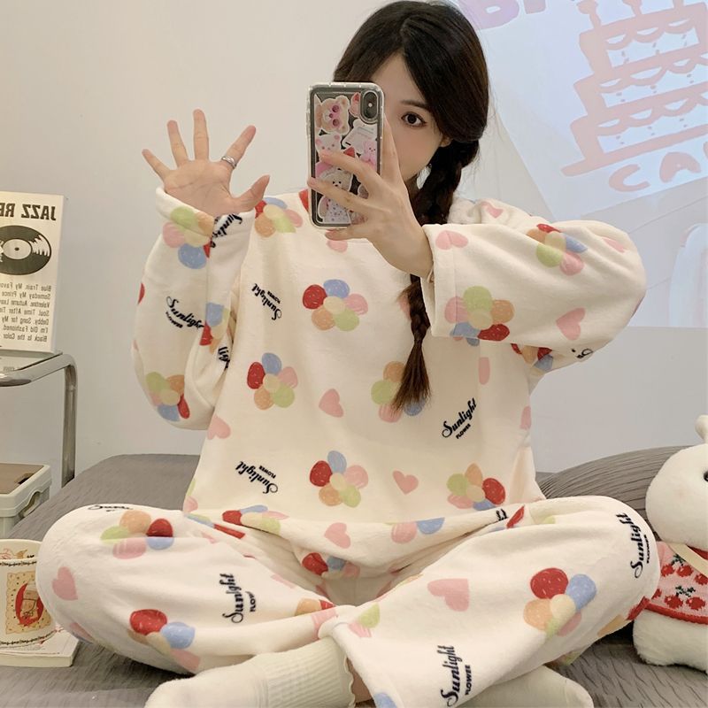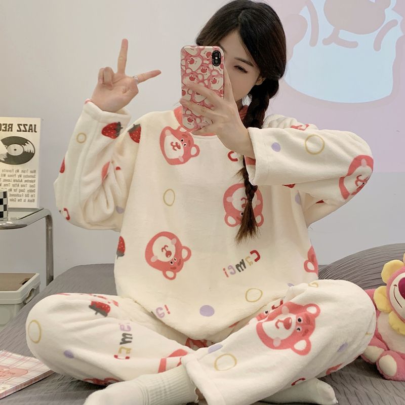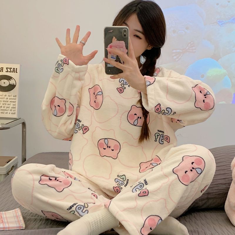 공장 저렴한 가격 2024 겨울 두꺼운 플란넬 여성 둥근 목 만화 파자마 두꺼운 산호 양털 여성용 세트 홈스토어 가기