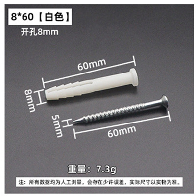 膨胀胶管尺寸足,膨胀胶管实测直径为8mm, 长度为60mm,80mm俩种长度,此款膨胀螺丝一般适用于8mm冲击钻头。