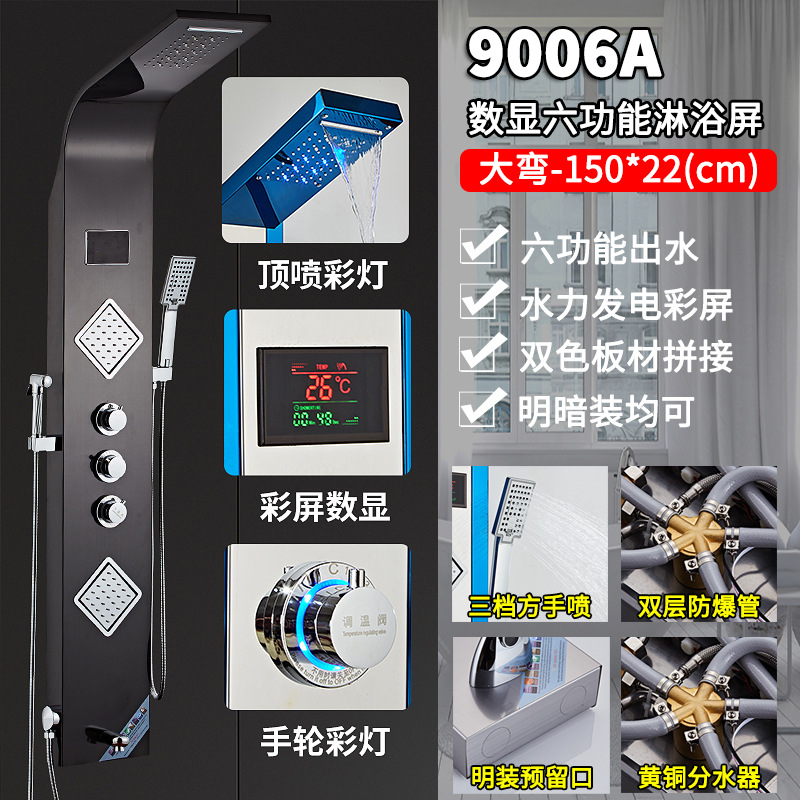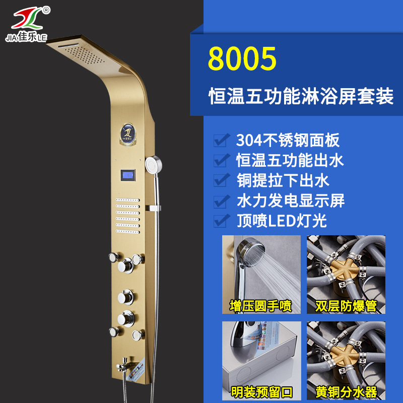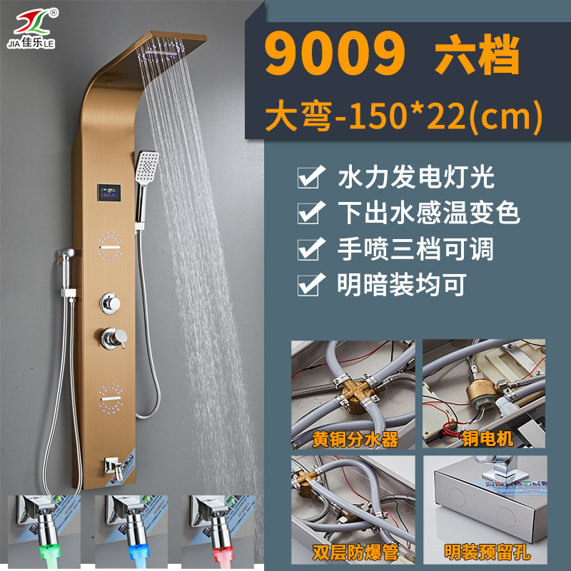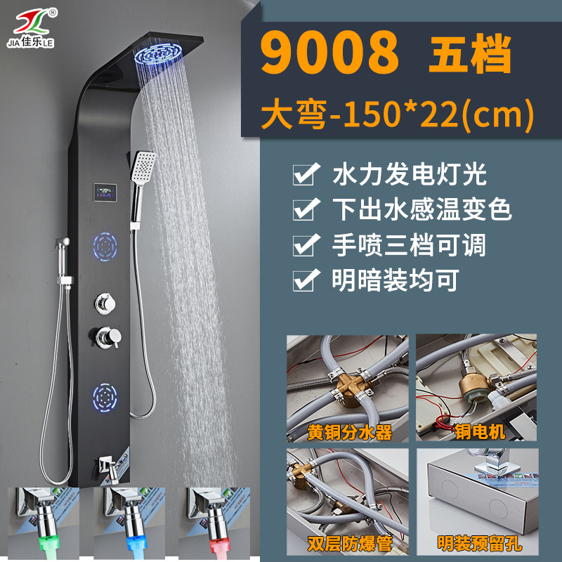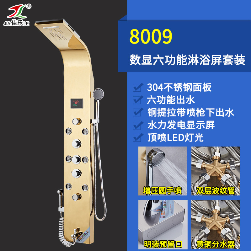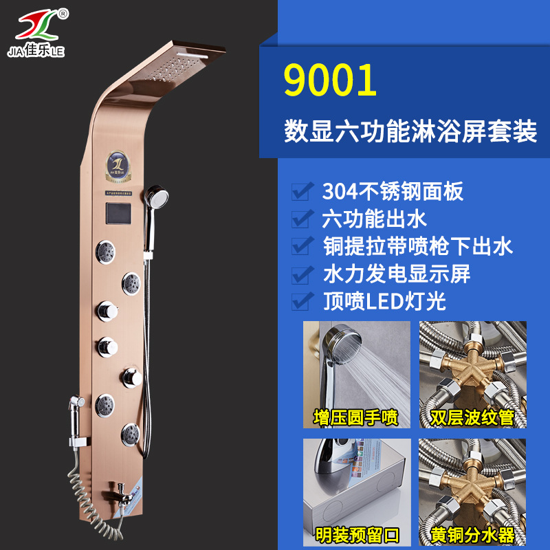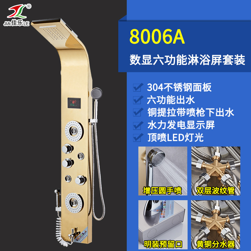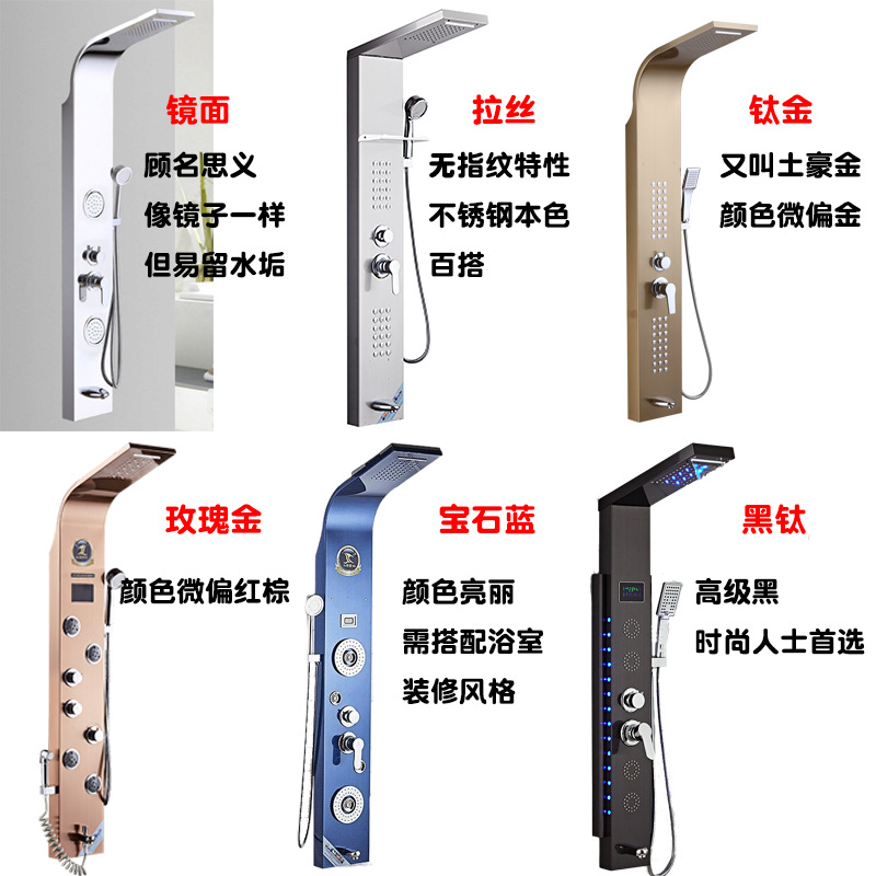每款淋浴屏都包含瀑布出水、顶喷淋雨、背喷按摩、手持花洒、下出水