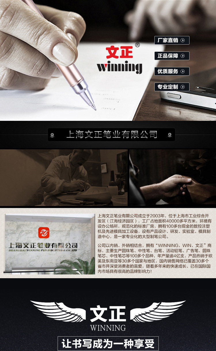 为了减少渠道商积压库存和资金周转的风险,我司所有商品均可支持混批,但部分商品因包装等因素,会设有最小起订量,一般为一盒起订。 商品库存 我司所有商品均是现货销售,备有库存;尽管如此,仍会有部分热销商品因需求量大,及工厂产量有限因素,会导致部分产品短时间缺货的情况,如碰到这种情况,我们会以电话或是旺旺方式告之交货期,征求您的意见是等货到齐发出还是部分商品先发出。 所有商品均为实物拍摄、最大限度的保证图片与实物是一致的,但不排除因光线或显示器色差因素,导致主观上的偏差;所有商品我们均为手工测量,因产品形状各异,测量标准会略有差异;不接受上述情况导致的退货及换货。 产品质量是企业生存基石,也是文正人创业之初就确立的原则,但再好的品质也无法保证合格率100%,我司所有产品都支持验收标准。为维护双方的利益,您收到的产品如有质量问题,请与我们售后工作人员联系详细沟通,经确认证实是质量问题,可以退货退款或换货,并运费由我公司承担。 售后说明 广告笔、定制logo笔如商品无质量问题,我司不接受退货;流通产品请与我们售后客服协商处理,经我司相关工作人员同意后,在不影响二次销售(包装完好)的情况下,方可换货;为了减少售后成本和效率,我们建议您累积合并换货处理,经核实15天内换货有效,邮费自理。 快递及运费 我司所有销售产品均不包邮;推荐快递为申通快递,只要申通能到的地方推荐发申通快递,因为我司与申通达成战略合作,运费比较实惠。需要用其他快递及物流请告诉客服。谢谢! |