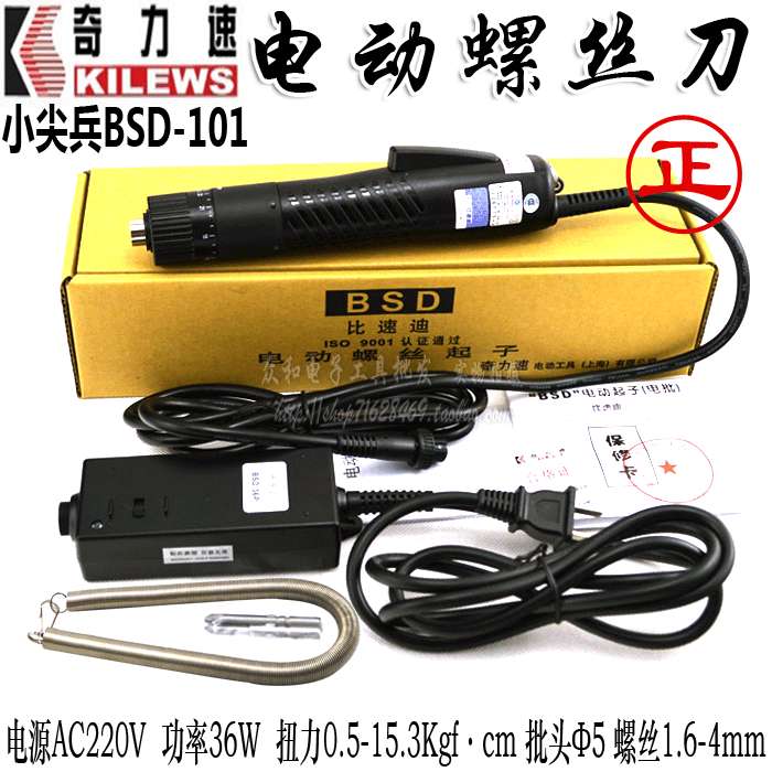 BSD101电批 | BSD 36P适配电源 | 操作说明书 | 保修卡 | 合格证 | Φ5批头 | 30cm电批弹簧 | 牛纸皮包装盒 |