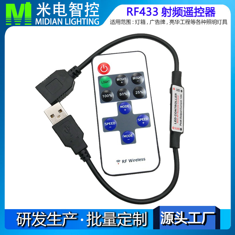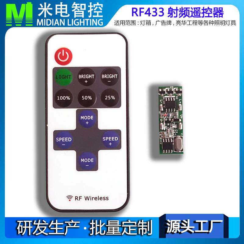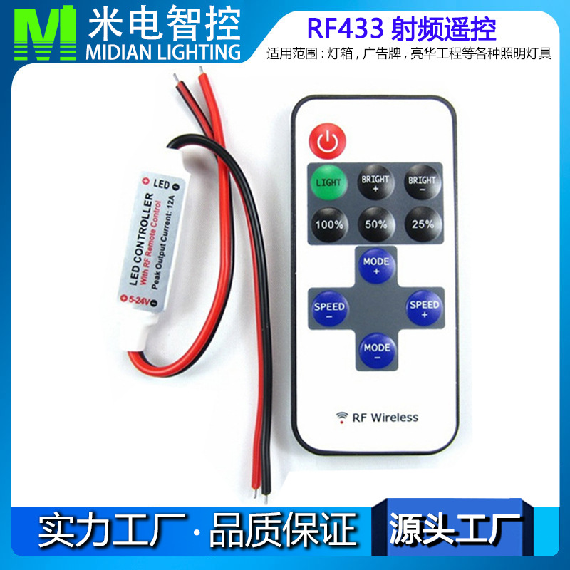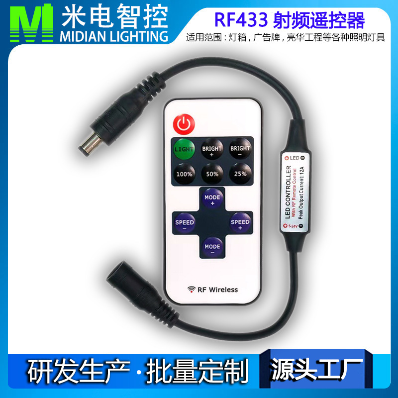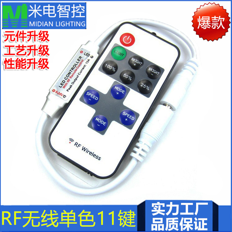 采用先进电脑控制芯片,通过433MHz无线信号进行控制,用于控制各种以led为光源的单色灯具,例如:点光源,软光条,洗墙灯,玻璃