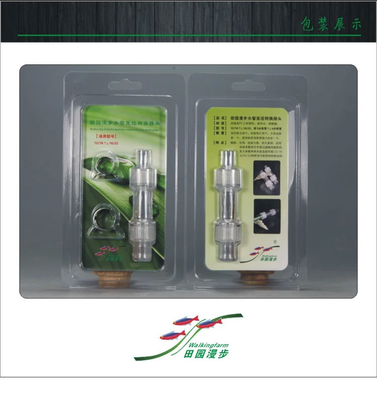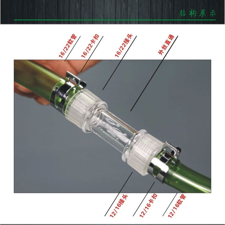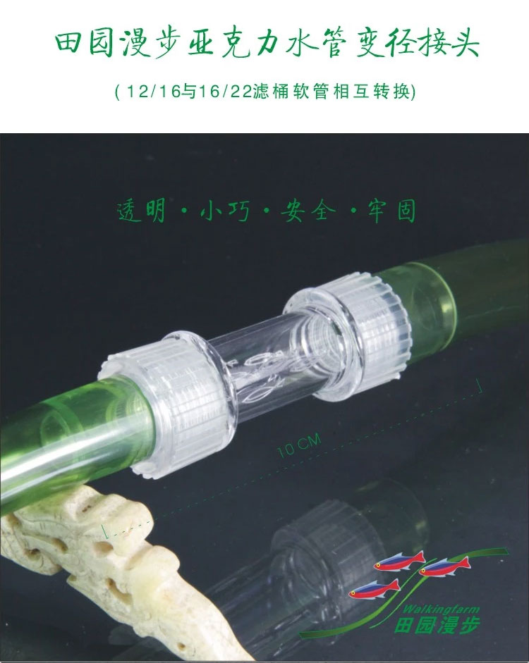 一款亚克力变径,另外用弹簧钢卡扣进行紧固,去除时间久软管硬化而造成脱落的担忧,更加安全牢靠。