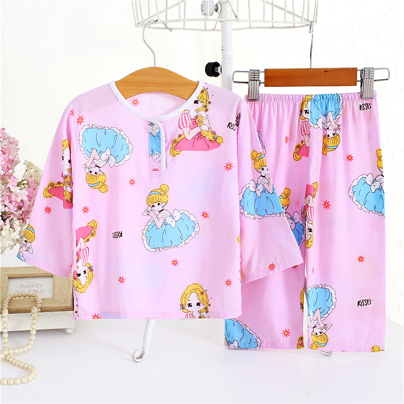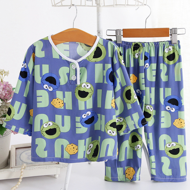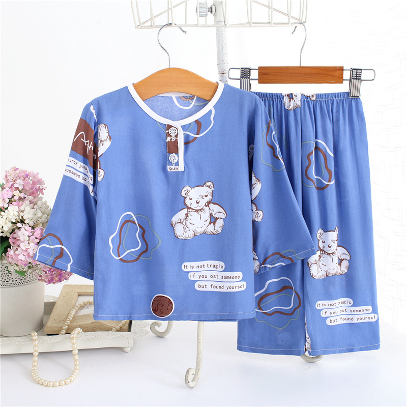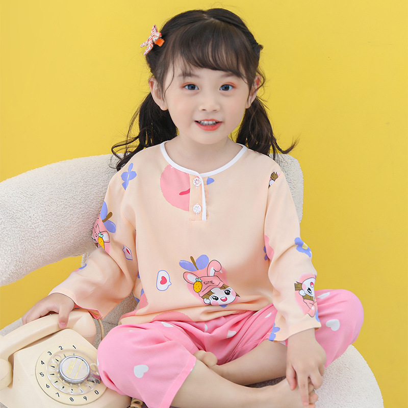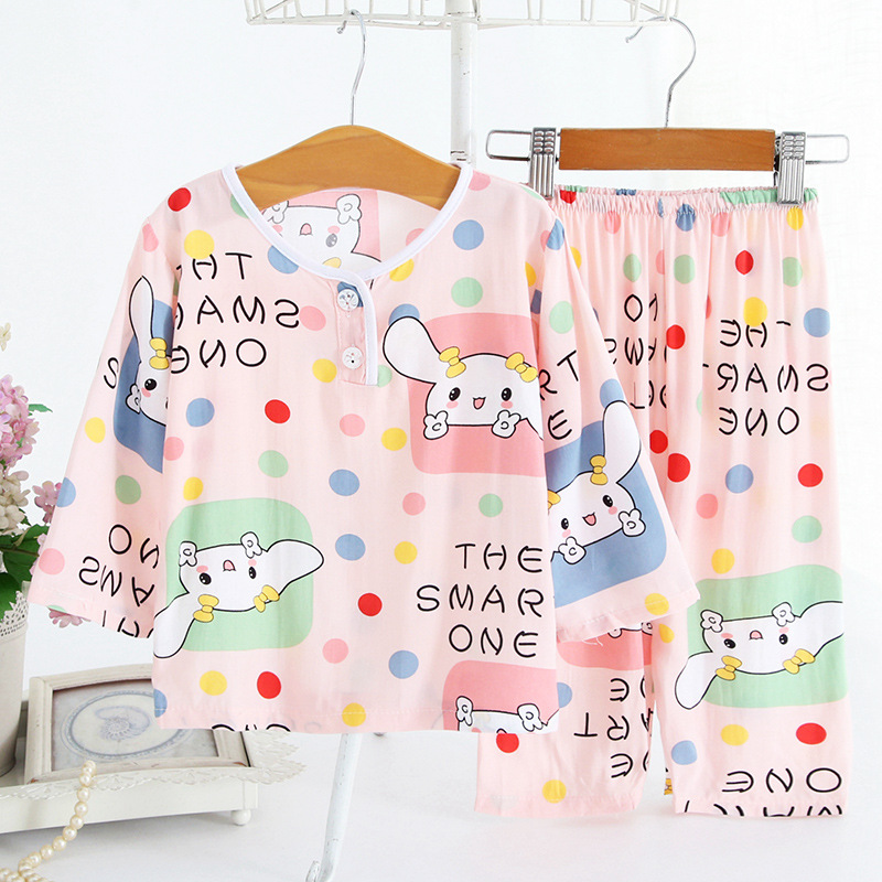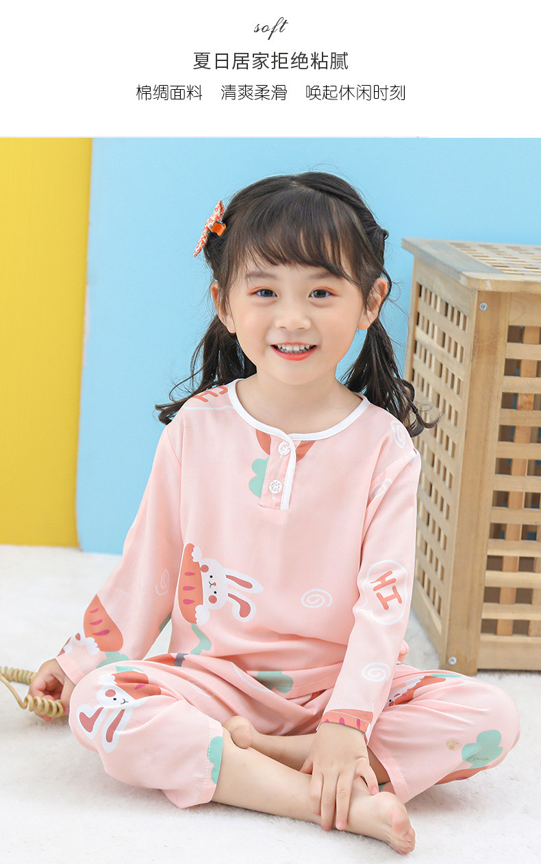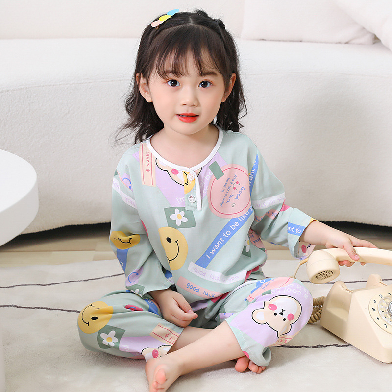 어린이 면 실크 잠옷 여름 얇은 면 실크 긴 소매 아기 가정 옷 소년과 소녀 세트 마구간 도매