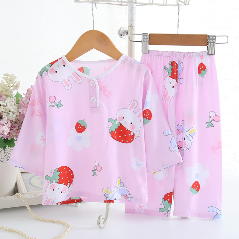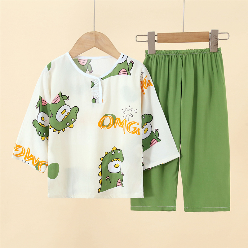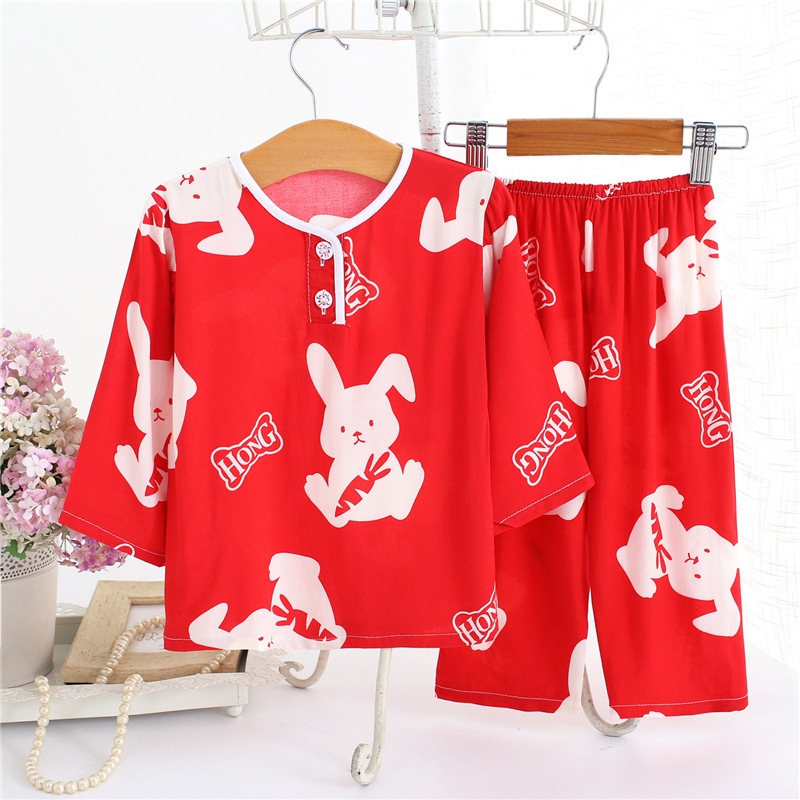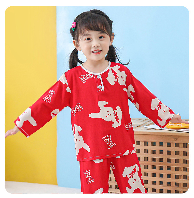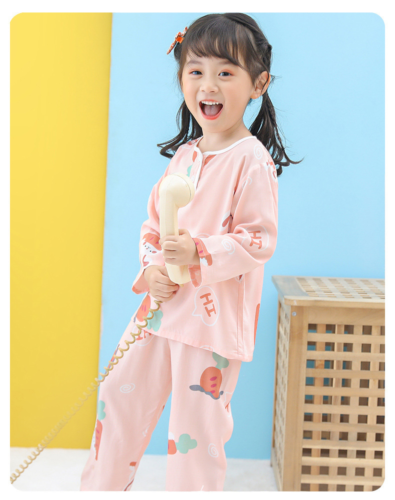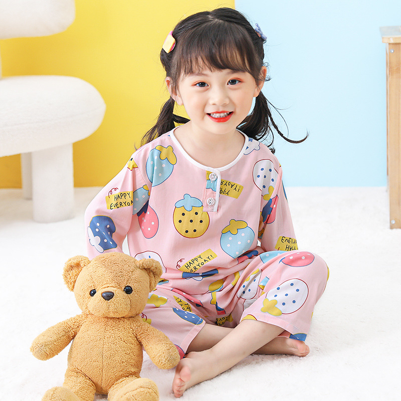 어린이 면 실크 잠옷 여름 얇은 면 실크 긴 소매 아기 가정 옷 소년과 소녀 세트 마구간 도매