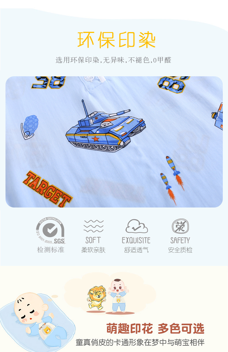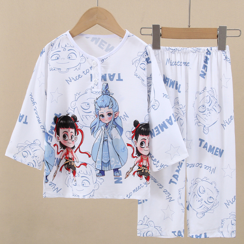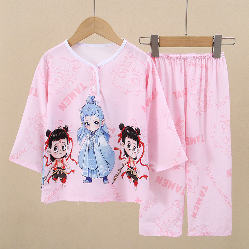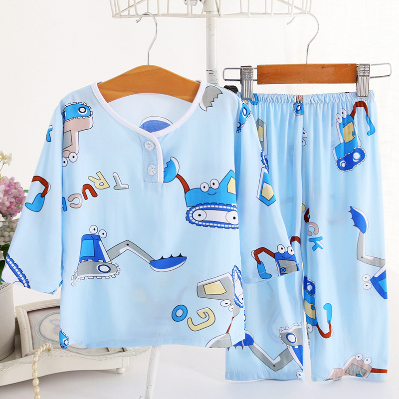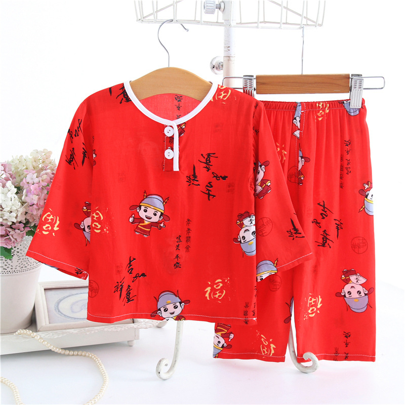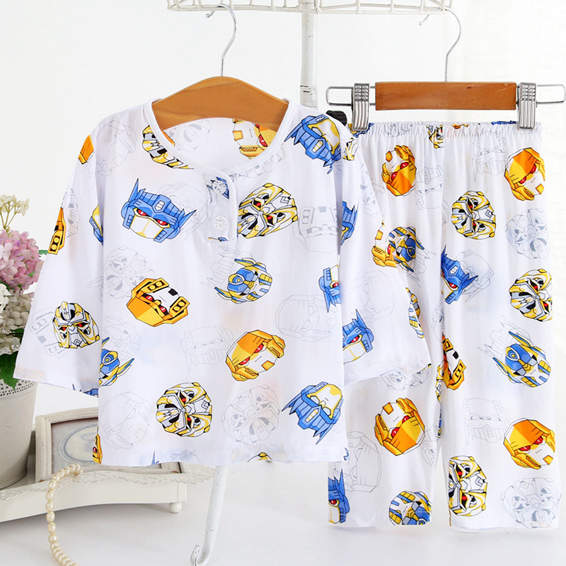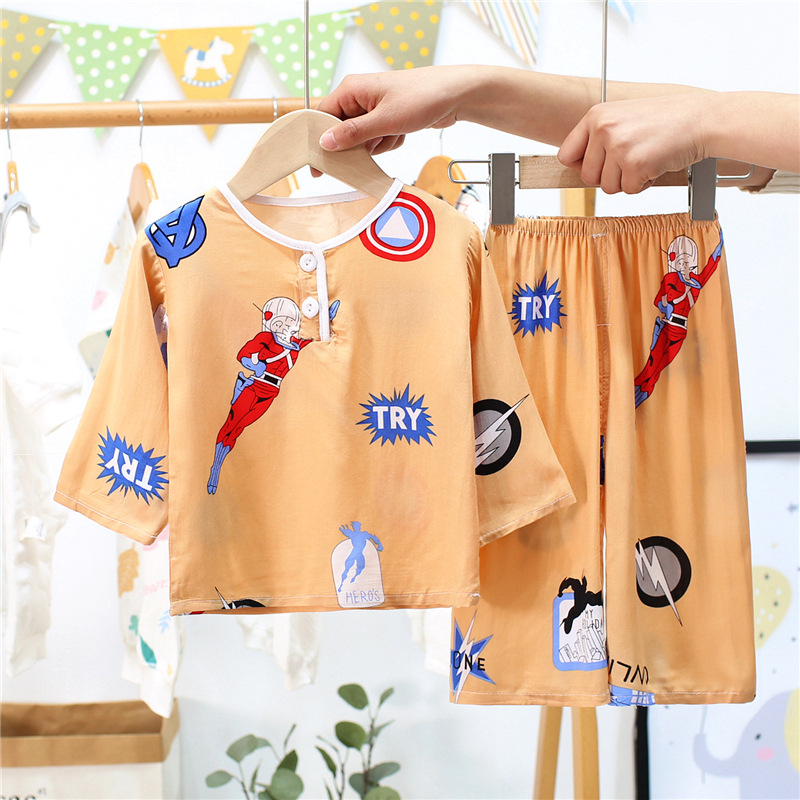 어린이 면 실크 잠옷 여름 얇은 면 실크 긴 소매 아기 가정 옷 소년과 소녀 세트 마구간 도매