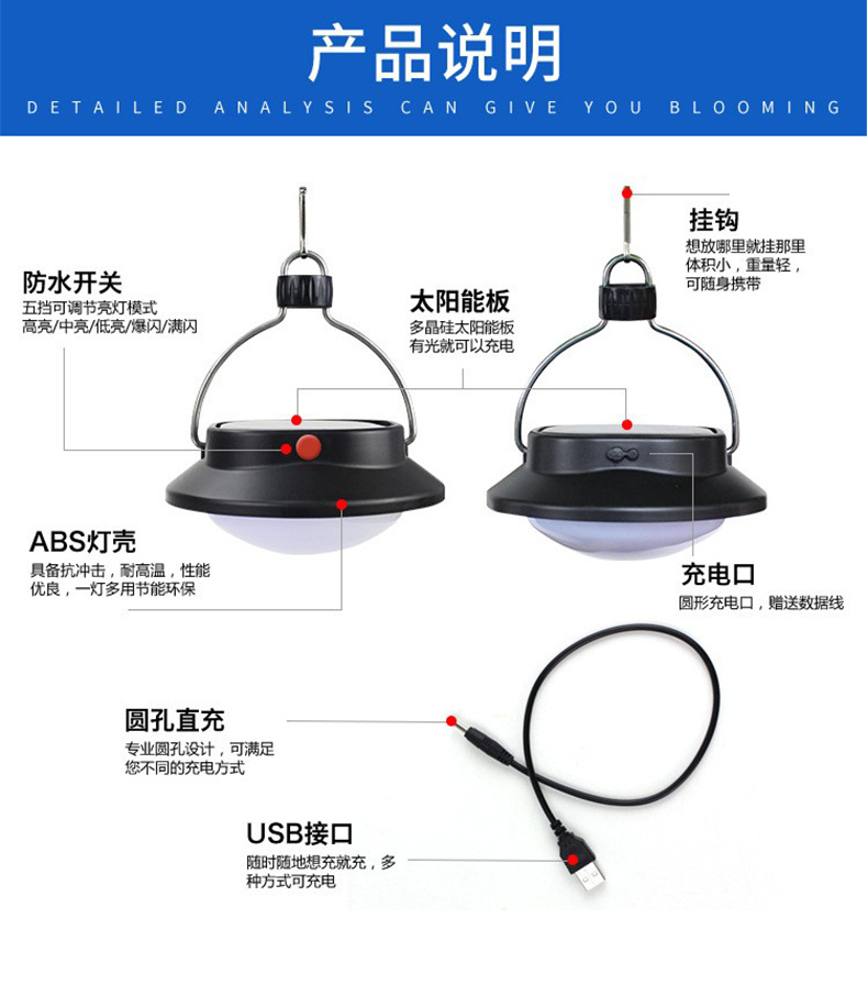 태양광 야외 캠핑 라이트, 텐트 걸이등, USB 충전 텐트 라이트, 휴대용 방수 캠핑 비상등