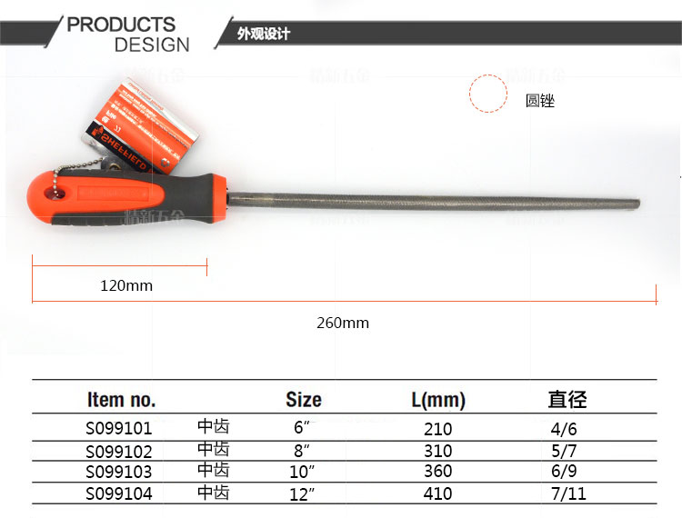 강철 방패 도구 중간 치아 라운드 파일 6/8/10/12 인치 철 파일 더블 컬러 플라스틱 핸들 라운드 녀석 S099305