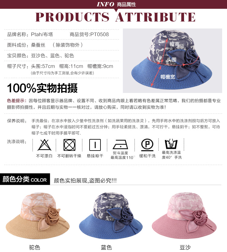 부타 모자 여성용 여름 자외선 차단제 모자 실크 한국식 차양 모자 유행 접이식 비치 모자 PT0508