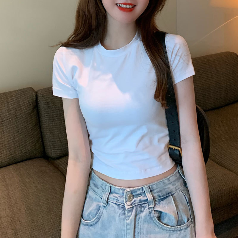 2022 새로운 한국 스타일 하이 넥 배꼽 노출 흰색 티셔츠 반팔 슬림 여성 여름 코튼 티셔츠 원피스 드롭 배송 기본 셔츠 027스토어 가기
