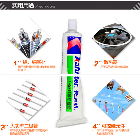 清洗待覆表面,除去油污,然后将导热硅酯直接挤出,均匀的涂覆要待涂覆表面即可。涂覆方式可根据需要采用刷涂、刮涂或滚涂。