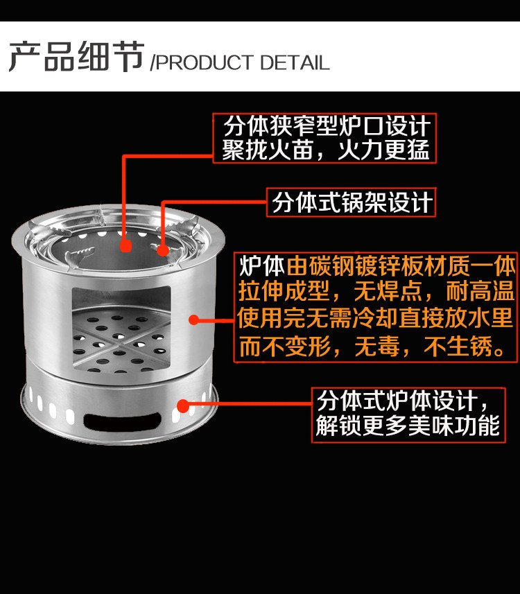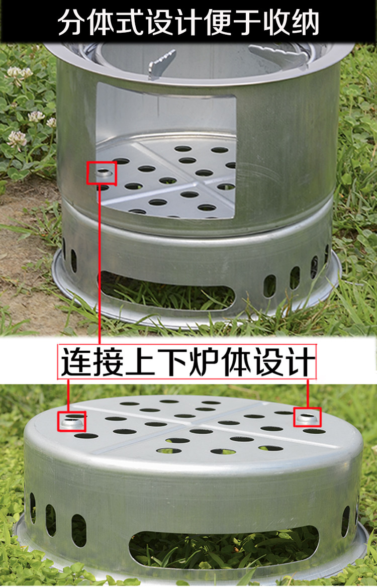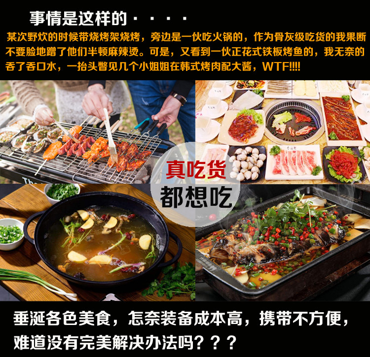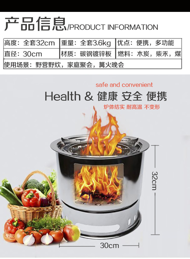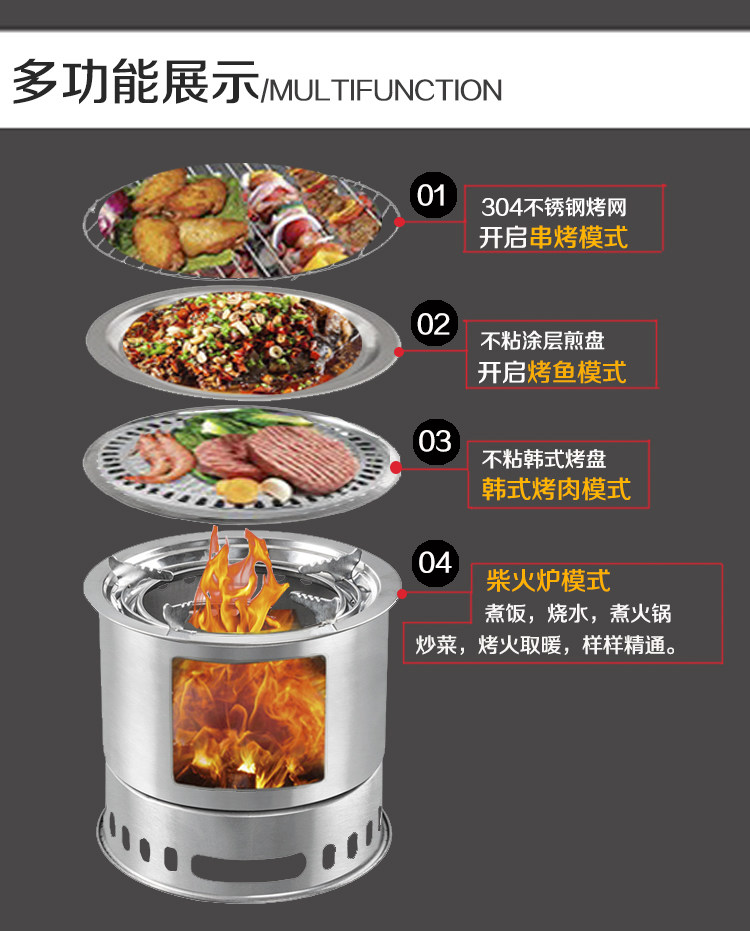 解说:此款产品采用的是碳钢材质,炉体全拉伸工艺,表面无焊点,无接口,一次性成形,表面处理采用了镀锌镀铬(检测无毒),风吹日晒杜绝生锈 。宝贝功能齐全,可烧炖、串烤、韩式烧烤、烤鱼等,一炉多用。可代替家用炉灶、煤气灶,不管是在室内还是室外都可发挥无限的用处。夏日炎炎,晚餐后或是家庭聚餐,可在阳台或是庭院摆上烧烤用炉,配点小酒,尽可畅饮闲聊享受无尽的烧烤乐趣。节假日出游带上一套,就地取柴烧烤一体,全面开工,尽享野外生活应有尽有,同时我们还专门订制了牛津布袋包,方便携带出门,收纳后占地面积小,可往车箱随便一丢,你若拥有,出门无忧!