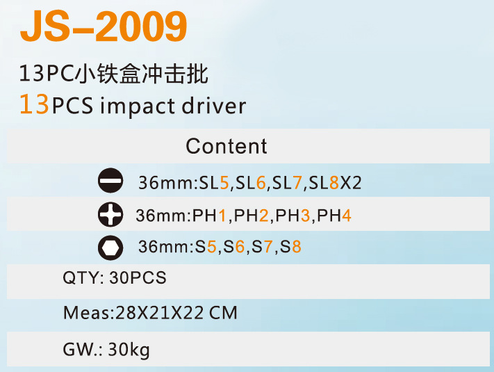 13 피스 임팩트 배치 세트 아이언 박스 스크루 드라이버 세트 조합 임팩트 배치 하드웨어 도구 JS-2009