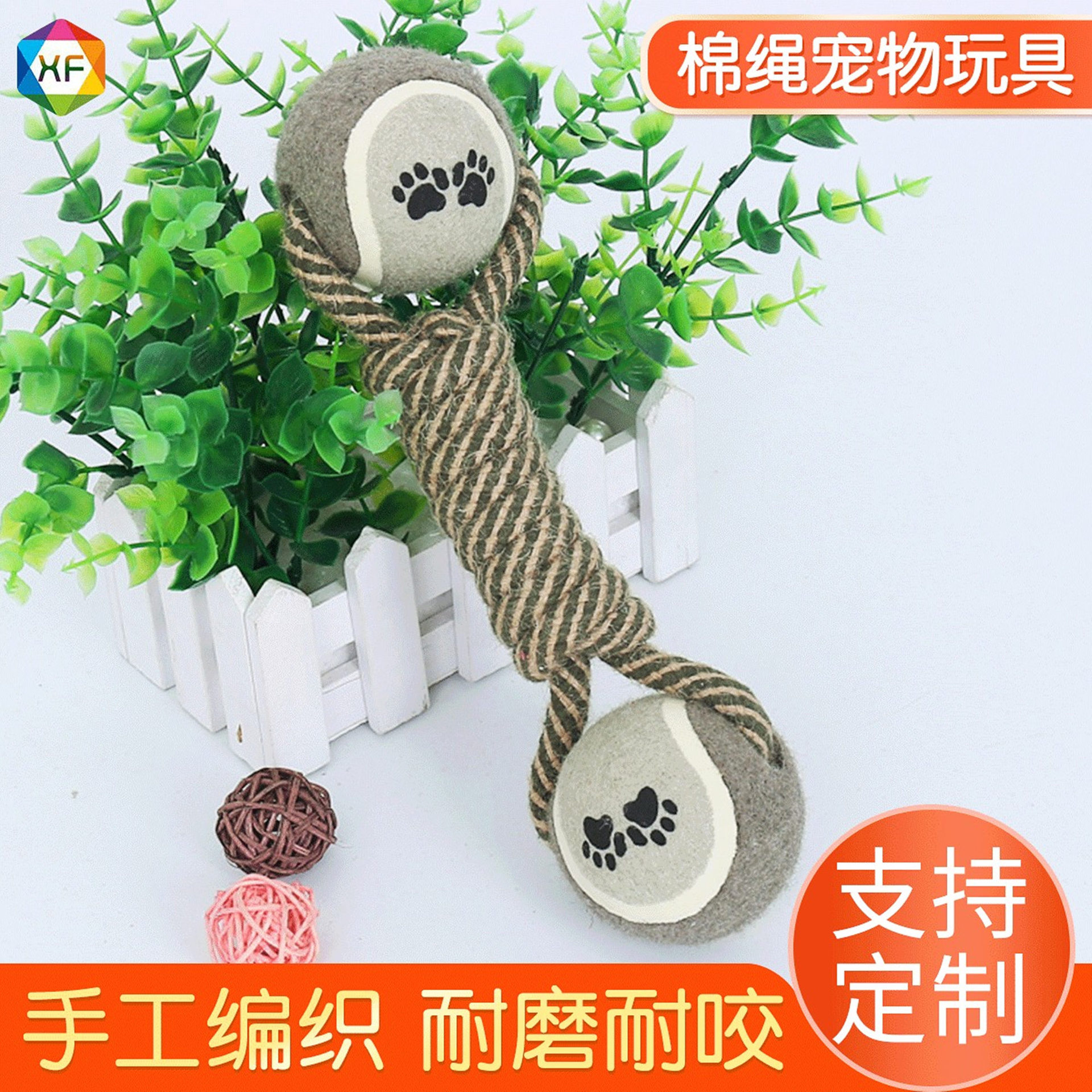 棉绳部分由麻绳+再生棉制成,搭配同色系网球,