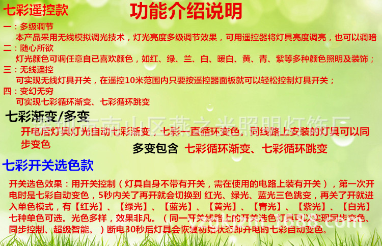 光色:正白光 暖白光 红光 黄光 蓝光 绿光 紫光 红绿蓝三彩 七彩自变色 七彩+遥控 七彩开关控制变色