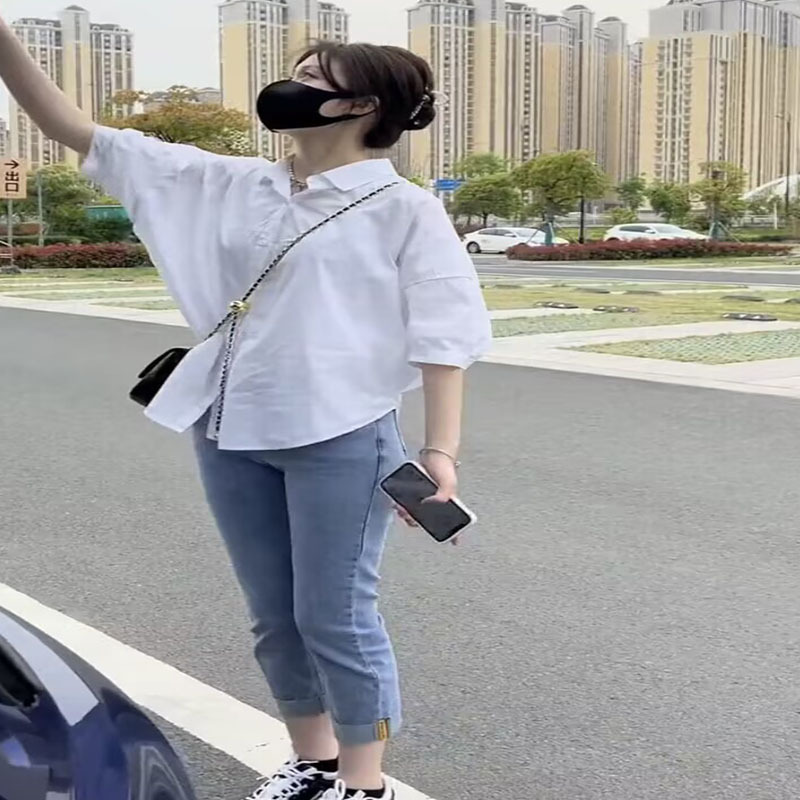 중간 소매 얇은 흰색 셔츠 여성의 태양 보호 의류 2024 여름 새로운 느슨한 슬림 핏 핫 셔츠 캐주얼 작은 셔츠스토어 가기