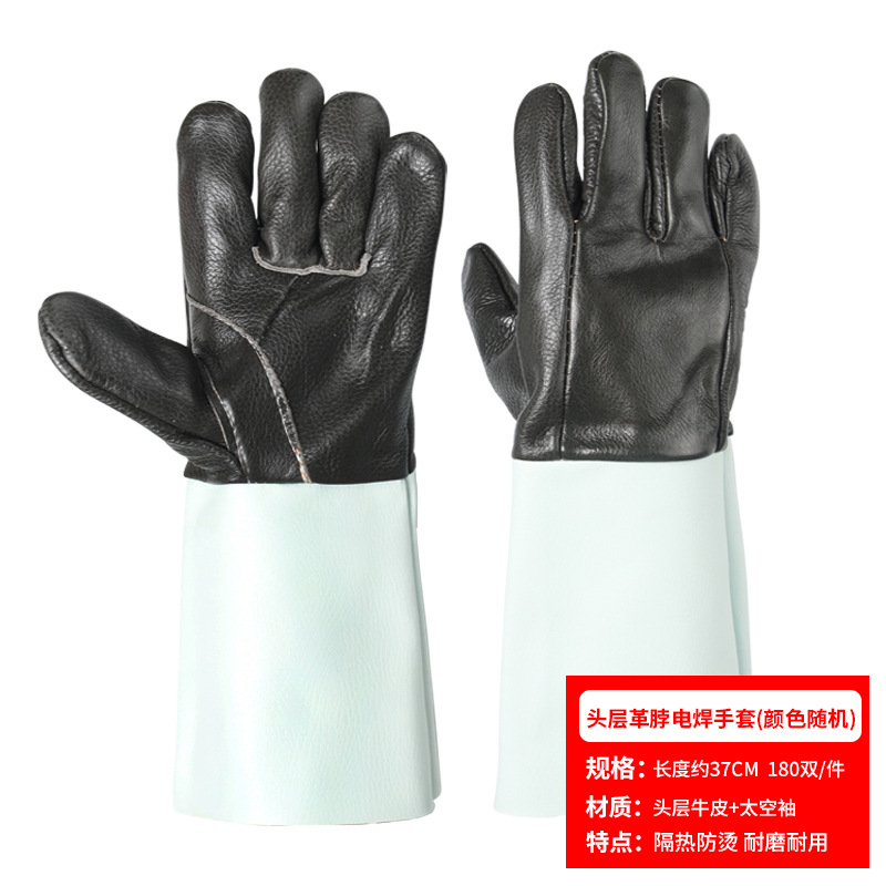 재고 내마모성 긴 전기 용접 장갑 헤드 레이어 소 가죽 소매 연장 용접기 노동 보호 장갑 제조 업체 도매
