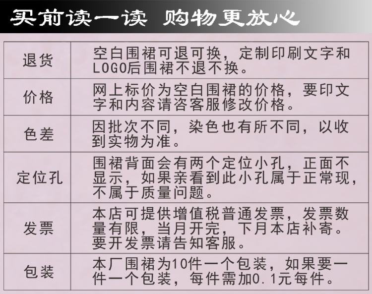 • 拿样支付后15天内,二次店铺进货返还此款围裙的样品费。