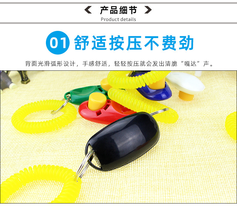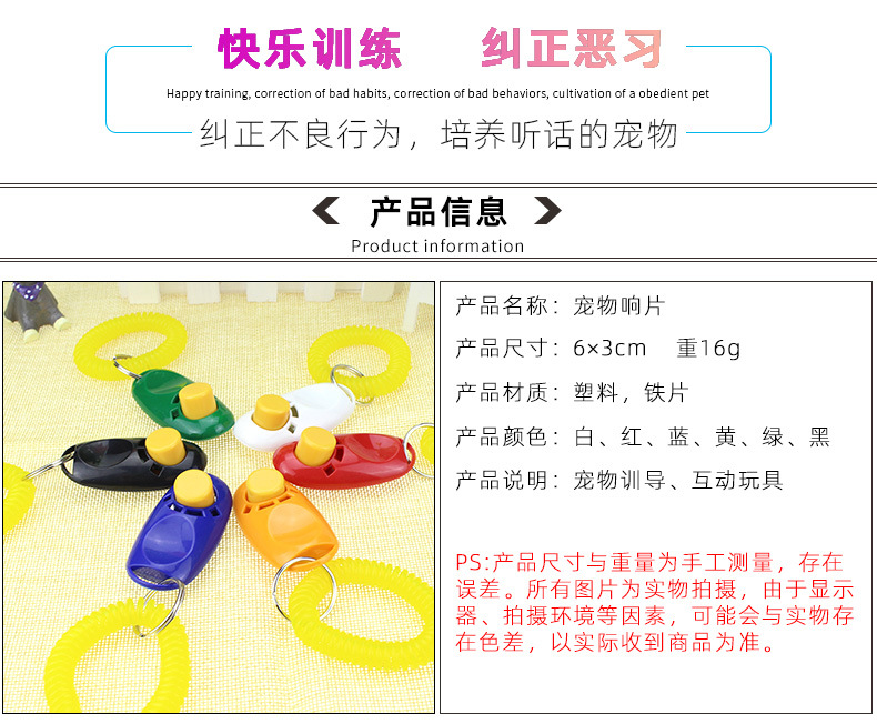 【商品介绍】:“响片”的英文为Clicker,是会发出清脆“喀答”声音的与宠物沟通的工具。响片训练过程中不需要打骂动物,只需要建立起彼此的信任,让它懂得怎样去思考及正面加强我们希望牠做的事。