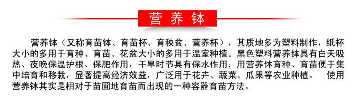 本店营养钵,均系厂家直销 质量保证,友情提醒:6.5x6.5--50*50型号营养钵,厂家的营养钵规格,实际尺寸偏小,首次购买一定要跟客服沟通了解产品 量多可以定做加厚 货少的发快递 !货多的发物流(快运物流和配货托运物流)。满意的价格!诚邀和您合作~本店营养钵,均系厂家直供,质量保证,量大优惠。