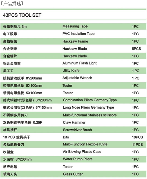 전원 사자 43 개 세트 가정용 도구 세트 43PC 가정용 조합 도구 하드웨어 도구 W043