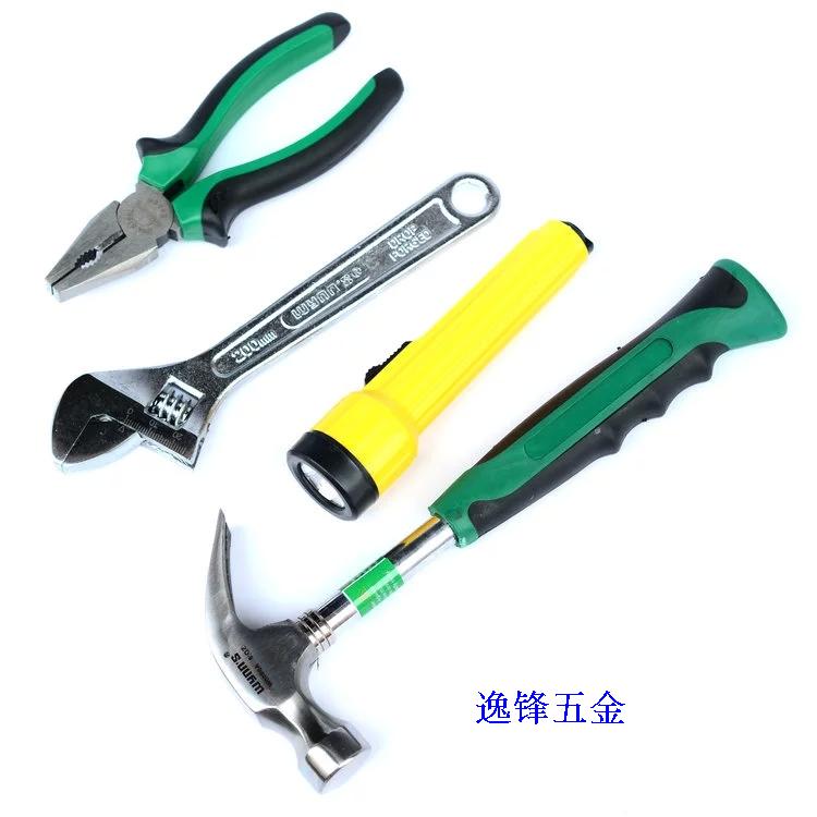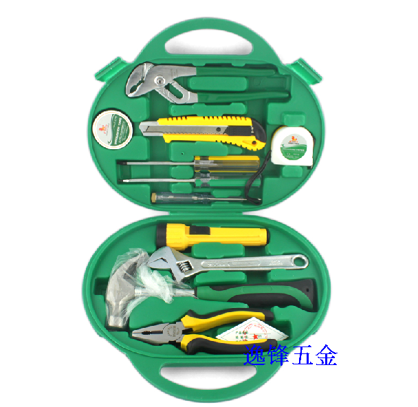 8’’200MM水泵钳    1个 美工刀    1个 旋具6*100十一字   2个 电笔   1个 手电筒    1个8‘‘200MM活动扳手   1个 0.25KG羊角锤   1个 6’’150MM钢丝钳   1个 2M钢卷尺    1个 电胶布   1个 吹塑盒