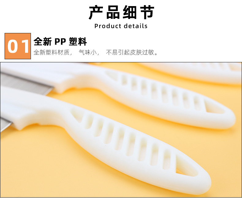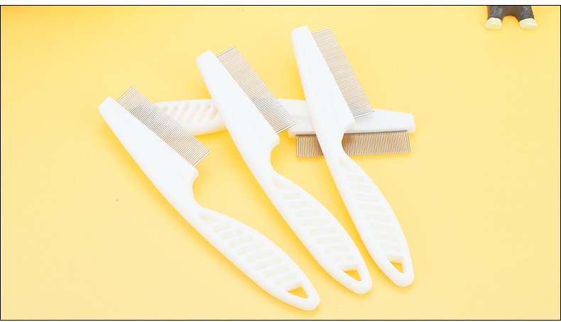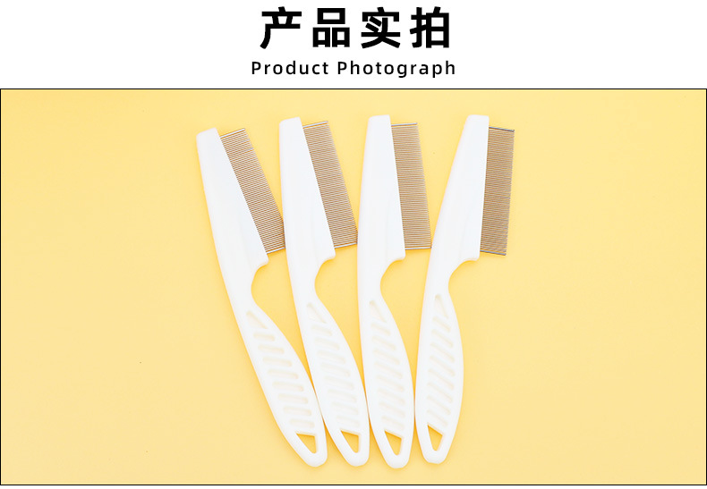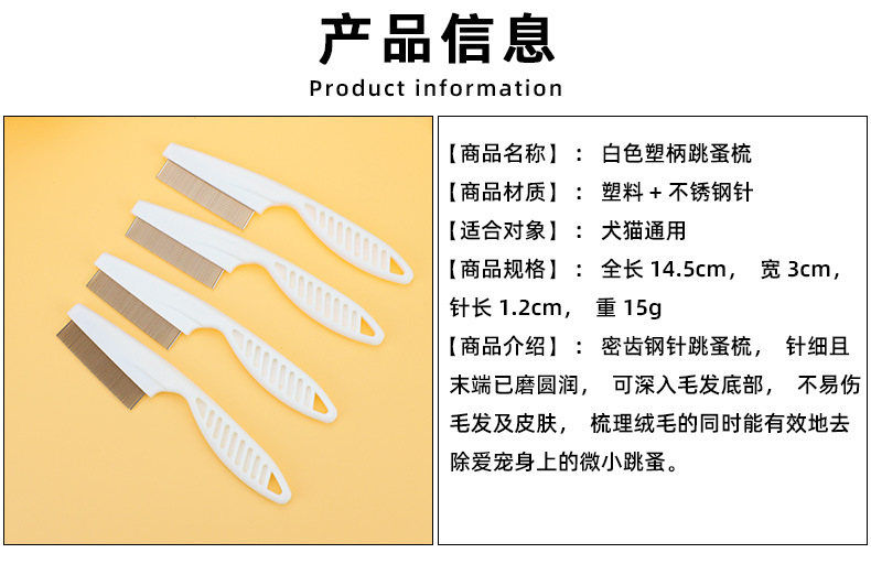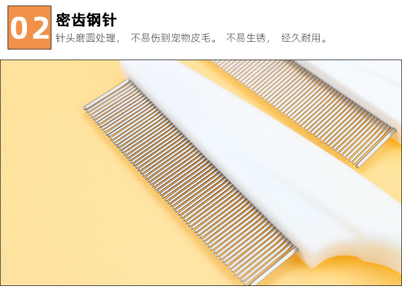 【商品介绍】:密齿间距钢针,针细且末端已磨圆润,深入宠物毛发底部,不易弄伤毛发及皮肤,梳理绒毛的同时能有效地去除爱宠身上的微小跳蚤。白色塑柄,拿握方便,使用便捷。