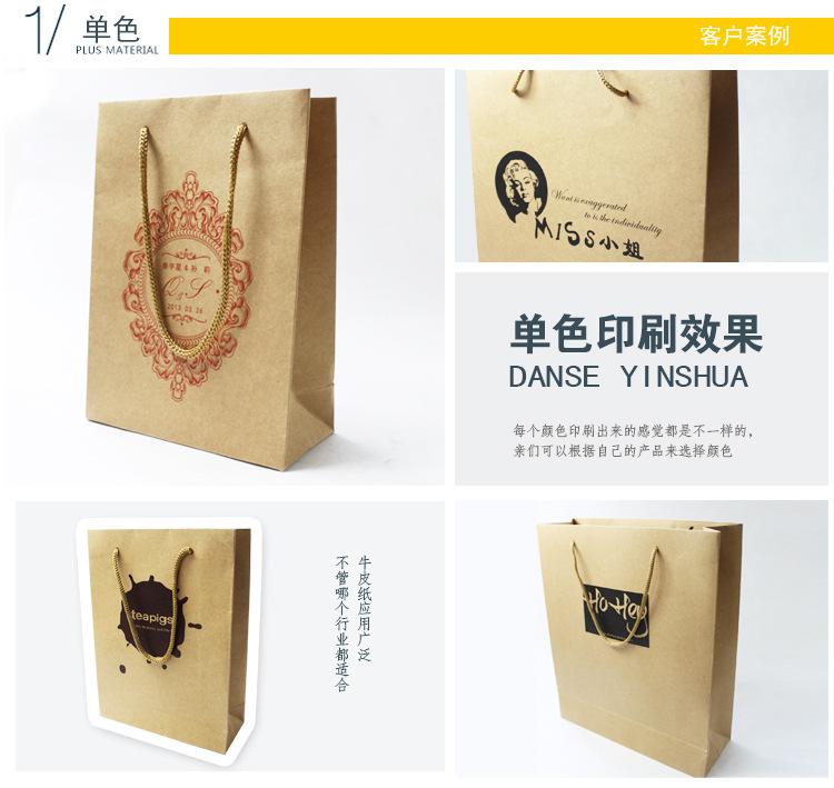 此款纸袋为现货款,无任何广告印刷,直接拍下,可即时发货。如客户须要加印广告,500个起可以单色双面加印,1000个起可以定做尺寸印刷,印刷需要按客户要求报价,具体价格请咨询客服!(纸袋加印广告可以选择胶印、丝印、烫金等工艺。欢迎新老客户来店咨询)