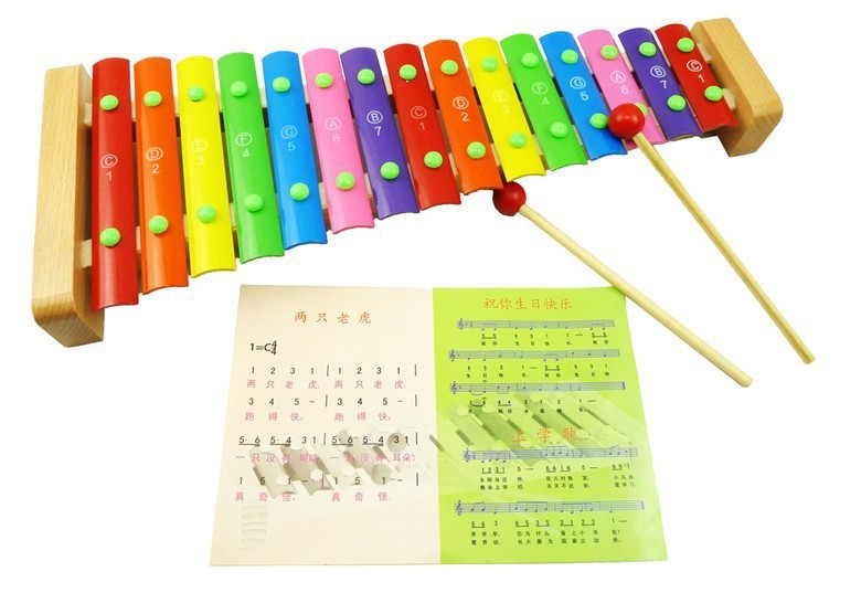 敲琴采用优质实木制成,乐声清脆、音色饱满。宝宝喜欢到处敲敲打打,通过两支敲击棒,可以演奏出美妙的音乐。家长可以敲奏简单乐曲给宝宝听,从最简单的“哆、嘞、咪”开始,培养孩子的音乐节奏感。宝宝们喜欢有声音的物体,敲击对宝宝肢体运动感觉很有帮助,同时也可以训练手眼协调能力。可爱别致的敲琴分别有着十五种不同的音阶,乐声清脆,音色饱满;让孩子在敲击的过程中开发孩子潜在的艺术细胞,增添乐感,从而达到学习音乐常识的目的。鲜艳亮丽的色彩能产生更大的吸引力,让宝宝对色彩进行更多的认识。宝宝们喜欢有声音的物体,敲击对宝宝肢体运动感觉很有帮助,同时也可以训练手眼协调能力。