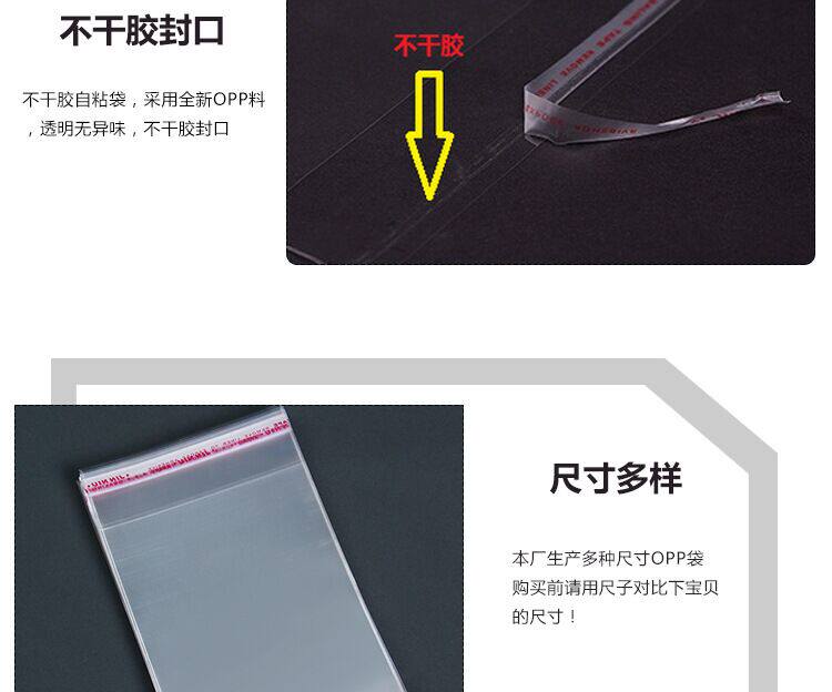 1.袋子材料;不干胶自粘袋,采用全新OPP料,透明无异味,不干胶封口,现货厚度为双层5丝9丝12丝和双层7丝。双层7丝要比双层5丝厚一些。如需其他 尺寸及厚度请联系掌柜定做。