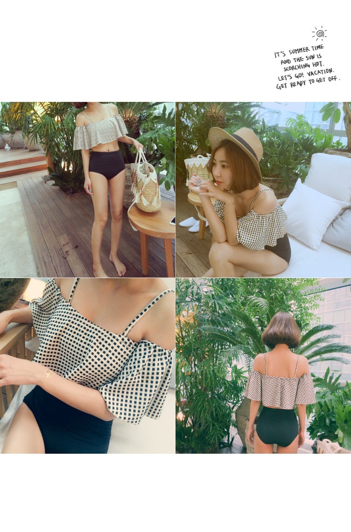 공장 직접 한국 새로운 한 단어 칼라 어깨 프릴 비키니 스플릿 하이 웨이스트 수영복 온천 여성 수영복스토어 가기