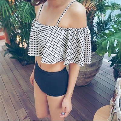 공장 직접 한국 새로운 한 단어 칼라 어깨 프릴 비키니 스플릿 하이 웨이스트 수영복 온천 여성 수영복
