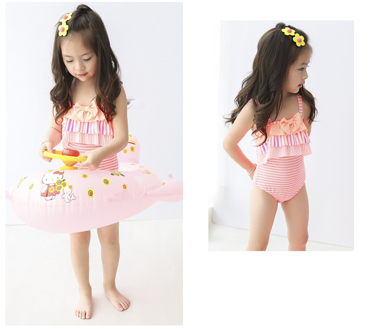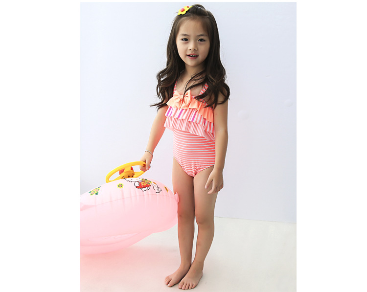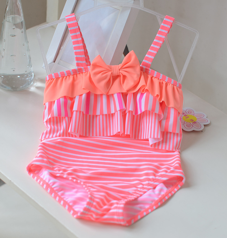 어린이 수영복 아기 작은 중학교 큰 어린이 학생 귀여운 소녀 오렌지 스트라이프 프린트 케이크 온천 원피스 수영복